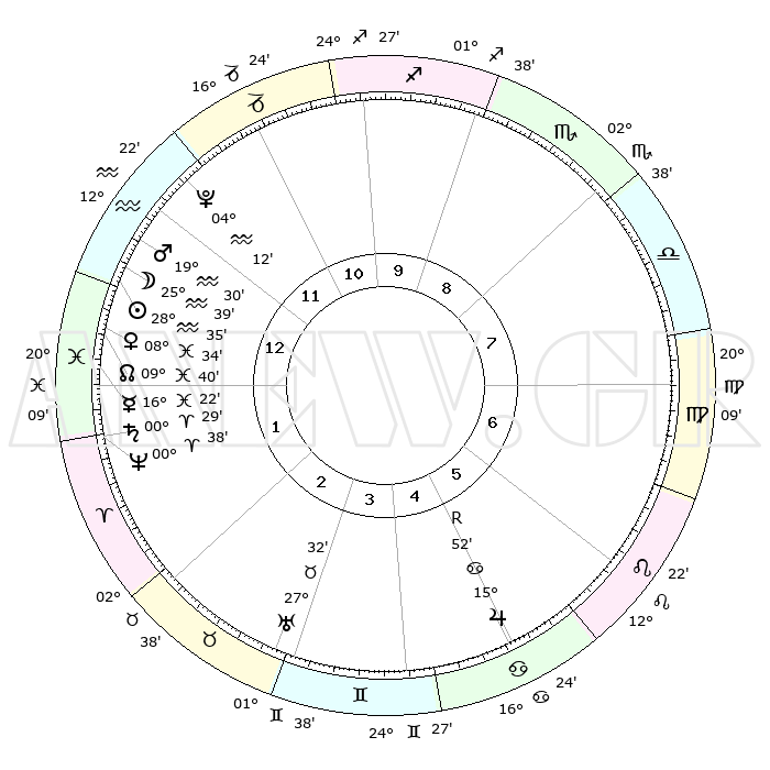 | | ΘΕΣΕΙΣ ΠΛΑΝΗΤΩΝ ΑΣΤΡΟΛΟΓΙΚΟΥ ΧΑΡΤΗ ΤΗΣ ΣΤΙΓΜΗΣ ΑΥΤΗΣ | | | | Πλανήτης | Ζώδιο | Μοίρες | Δεκαήμ. | Σε οίκο | Απόκλιση | | Ακμές των οίκων | | Ηλιος | Υδροχόος | 28°31' | Τρίτο | 1 | 11 S 59 | | 1ος | 15°52' | Υδροχόος | | Σελήνη | Υδροχόος | 24°49' | Τρίτο | 1 | 14 S 28 | | 2ος | 01°36' | Κριός | | Ερμής | Ιχθείς | 16°17' | Δεύτερο | 1 | 04 S 54 | | 3ος | 07°09' | Ταύρος | | Αφροδίτη | Ιχθείς | 08°29' | Πρώτο | 1 | 09 S 45 | | 4ος | 03°11' | Δίδυμοι | | Αρης | Υδροχόος | 19°27' | Δεύτερο | 1 | 16 S 01 | | 5ος | 25°07' | Δίδυμοι | | Δίας | Καρκίνος | 15°52'R | Δεύτερο | 5 | 22 N 49 | | 6ος | 17°25' | Καρκίνος | | Κρόνος | Κριός | 00°28' | Πρώτο | 1 | 01 S 47 | | 7ος | 15°52' | Λέων | | Ουρανός | Ταύρος | 27°32' | Τρίτο | 3 | 19 N 26 | | 8ος | 01°36' | Ζυγός | | Ποσειδώνας | Κριός | 00°38' | Πρώτο | 1 | 00 S 57 | | 9ος | 07°09' | Σκορπιός | | Πλούτωνας | Υδροχόος | 04°12' | Πρώτο | 12 | 22 S 56 | | 10ος | 03°11' | Τοξότης | | Β. Δεσμός | Ιχθείς | 09°40' | Πρώτο | 1 | 07 S 56 | | 11ος | 25°07' | Τοξότης | | Ωροσκόπος | Υδροχόος | 15°52' | Δεύτερο | | | 12ος | 17°25' | Αιγόκερως | | Μεσουράνημα | Τοξότης | 03°11' | Πρώτο | | | |