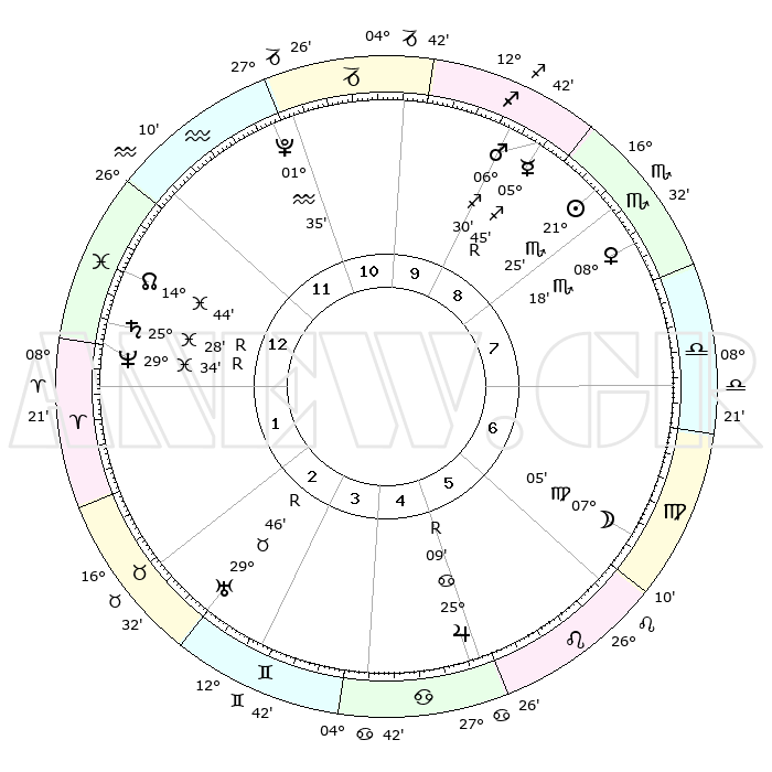| | ΘΕΣΕΙΣ ΠΛΑΝΗΤΩΝ ΑΣΤΡΟΛΟΓΙΚΟΥ ΧΑΡΤΗ ΤΗΣ ΣΤΙΓΜΗΣ ΑΥΤΗΣ | | | | Πλανήτης | Ζώδιο | Μοίρες | Δεκαήμ. | Σε οίκο | Απόκλιση | | Ακμές των οίκων | | Ηλιος | Σκορπιός | 21°21' | Τρίτο | 9 | 18 S 06 | | 1ος | 28°29' | Υδροχόος | | Σελήνη | Παρθένος | 06°13' | Πρώτο | 7 | 10 N 03 | | 2ος | 14°01' | Κριός | | Ερμής | Τοξότης | 05°47'R | Πρώτο | 9 | 22 S 52 | | 3ος | 17°02' | Ταύρος | | Αφροδίτη | Σκορπιός | 08°12' | Πρώτο | 8 | 13 S 04 | | 4ος | 11°35' | Δίδυμοι | | Αρης | Τοξότης | 06°27' | Πρώτο | 9 | 21 S 53 | | 5ος | 03°16' | Καρκίνος | | Δίας | Καρκίνος | 25°09'R | Τρίτο | 5 | 21 N 13 | | 6ος | 26°41' | Καρκίνος | | Κρόνος | Ιχθείς | 25°29'R | Τρίτο | 1 | 04 S 02 | | 7ος | 28°29' | Λέων | | Ουρανός | Ταύρος | 29°46'R | Τρίτο | 3 | 19 N 54 | | 8ος | 14°01' | Ζυγός | | Ποσειδώνας | Ιχθείς | 29°34'R | Τρίτο | 1 | 01 S 25 | | 9ος | 17°02' | Σκορπιός | | Πλούτωνας | Υδροχόος | 01°35' | Πρώτο | 12 | 23 S 29 | | 10ος | 11°35' | Τοξότης | | Β. Δεσμός | Ιχθείς | 14°44' | Δεύτερο | 1 | 06 S 01 | | 11ος | 03°16' | Αιγόκερως | | Ωροσκόπος | Υδροχόος | 28°29' | Τρίτο | | | 12ος | 26°41' | Αιγόκερως | | Μεσουράνημα | Τοξότης | 11°35' | Δεύτερο | | | |