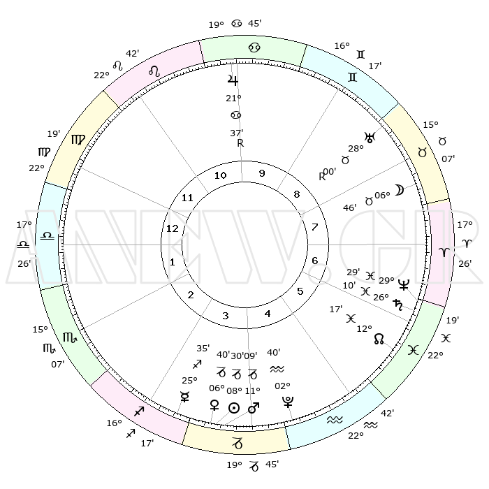 | | ΘΕΣΕΙΣ ΠΛΑΝΗΤΩΝ ΑΣΤΡΟΛΟΓΙΚΟΥ ΧΑΡΤΗ ΤΗΣ ΣΤΙΓΜΗΣ ΑΥΤΗΣ | | | | Πλανήτης | Ζώδιο | Μοίρες | Δεκαήμ. | Σε οίκο | Απόκλιση | | Ακμές των οίκων | | Ηλιος | Αιγόκερως | 08°26' | Πρώτο | 4 | 23 S 10 | | 1ος | 26°34' | Παρθένος | | Σελήνη | Ταύρος | 05°45' | Πρώτο | 8 | 17 N 20 | | 2ος | 22°54' | Ζυγός | | Ερμής | Τοξότης | 25°28' | Τρίτο | 3 | 23 S 41 | | 3ος | 23°12' | Σκορπιός | | Αφροδίτη | Αιγόκερως | 06°34' | Πρώτο | 4 | 23 S 42 | | 4ος | 26°09' | Τοξότης | | Αρης | Αιγόκερως | 11°05' | Δεύτερο | 4 | 23 S 51 | | 5ος | 29°10' | Αιγόκερως | | Δίας | Καρκίνος | 21°38'R | Τρίτο | 10 | 21 N 56 | | 6ος | 29°44' | Υδροχόος | | Κρόνος | Ιχθείς | 26°10' | Τρίτο | 6 | 03 S 36 | | 7ος | 26°34' | Ιχθείς | | Ουρανός | Ταύρος | 28°00'R | Τρίτο | 9 | 19 N 31 | | 8ος | 22°54' | Κριός | | Ποσειδώνας | Ιχθείς | 29°29' | Τρίτο | 7 | 01 S 26 | | 9ος | 23°12' | Ταύρος | | Πλούτωνας | Υδροχόος | 02°40' | Πρώτο | 5 | 23 S 14 | | 10ος | 26°09' | Δίδυμοι | | Β. Δεσμός | Ιχθείς | 12°17' | Δεύτερο | 6 | 06 S 57 | | 11ος | 29°10' | Καρκίνος | | Ωροσκόπος | Παρθένος | 26°34' | Τρίτο | | | 12ος | 29°44' | Λέων | | Μεσουράνημα | Δίδυμοι | 26°09' | Τρίτο | | | |