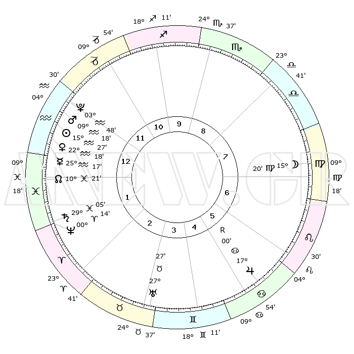| | ΘΕΣΕΙΣ ΠΛΑΝΗΤΩΝ ΑΣΤΡΟΛΟΓΙΚΟΥ ΧΑΡΤΗ ΤΗΣ ΣΤΙΓΜΗΣ ΑΥΤΗΣ | | | | Πλανήτης | Ζώδιο | Μοίρες | Δεκαήμ. | Σε οίκο | Απόκλιση | | Ακμές των οίκων | | Ηλιος | Υδροχόος | 15°24' | Δεύτερο | 1 | 16 S 13 | | 1ος | 10°12' | Υδροχόος | | Σελήνη | Παρθένος | 14°35' | Δεύτερο | 7 | 05 N 36 | | 2ος | 25°35' | Ιχθείς | | Ερμής | Υδροχόος | 25°11' | Τρίτο | 1 | 14 S 40 | | 3ος | 02°14' | Ταύρος | | Αφροδίτη | Υδροχόος | 22°14' | Τρίτο | 1 | 15 S 26 | | 4ος | 29°04' | Ταύρος | | Αρης | Υδροχόος | 09°15' | Πρώτο | 12 | 18 S 57 | | 5ος | 21°13' | Δίδυμοι | | Δίας | Καρκίνος | 17°00'R | Δεύτερο | 6 | 22 N 40 | | 6ος | 13°08' | Καρκίνος | | Κρόνος | Ιχθείς | 29°05' | Τρίτο | 2 | 02 S 21 | | 7ος | 10°12' | Λέων | | Ουρανός | Ταύρος | 27°27' | Τρίτο | 3 | 19 N 24 | | 8ος | 25°35' | Παρθένος | | Ποσειδώνας | Κριός | 00°14' | Πρώτο | 2 | 01 S 07 | | 9ος | 02°14' | Σκορπιός | | Πλούτωνας | Υδροχόος | 03°48' | Πρώτο | 12 | 23 S 00 | | 10ος | 29°04' | Σκορπιός | | Β. Δεσμός | Ιχθείς | 10°21' | Δεύτερο | 1 | 07 S 41 | | 11ος | 21°13' | Τοξότης | | Ωροσκόπος | Υδροχόος | 10°12' | Δεύτερο | | | 12ος | 13°08' | Αιγόκερως | | Μεσουράνημα | Σκορπιός | 29°04' | Τρίτο | | | |