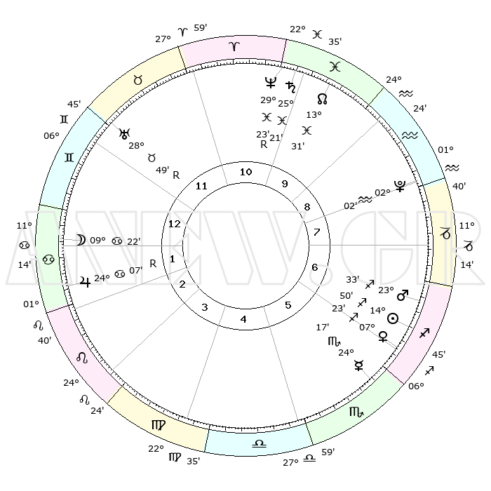 | | ΘΕΣΕΙΣ ΠΛΑΝΗΤΩΝ ΑΣΤΡΟΛΟΓΙΚΟΥ ΧΑΡΤΗ ΤΗΣ ΣΤΙΓΜΗΣ ΑΥΤΗΣ | | | | Πλανήτης | Ζώδιο | Μοίρες | Δεκαήμ. | Σε οίκο | Απόκλιση | | Ακμές των οίκων | | Ηλιος | Τοξότης | 14°45' | Δεύτερο | 6 | 22 S 34 | | 1ος | 18°08' | Δίδυμοι | | Σελήνη | Καρκίνος | 08°20' | Πρώτο | 1 | 27 N 42 | | 2ος | 09°60' | Καρκίνος | | Ερμής | Σκορπιός | 24°13' | Τρίτο | 6 | 16 S 28 | | 3ος | 01°16' | Λέων | | Αφροδίτη | Τοξότης | 07°18' | Πρώτο | 6 | 21 S 02 | | 4ος | 25°52' | Λέων | | Αρης | Τοξότης | 23°30' | Τρίτο | 7 | 23 S 59 | | 5ος | 27°42' | Παρθένος | | Δίας | Καρκίνος | 24°08'R | Τρίτο | 2 | 21 N 27 | | 6ος | 07°57' | Σκορπιός | | Κρόνος | Ιχθείς | 25°21' | Τρίτο | 10 | 04 S 00 | | 7ος | 18°08' | Τοξότης | | Ουρανός | Ταύρος | 28°49'R | Τρίτο | 12 | 19 N 41 | | 8ος | 09°60' | Αιγόκερως | | Ποσειδώνας | Ιχθείς | 29°23'R | Τρίτο | 11 | 01 S 29 | | 9ος | 01°16' | Υδροχόος | | Πλούτωνας | Υδροχόος | 02°02' | Πρώτο | 9 | 23 S 22 | | 10ος | 25°52' | Υδροχόος | | Β. Δεσμός | Ιχθείς | 13°31' | Δεύτερο | 10 | 06 S 29 | | 11ος | 27°42' | Ιχθείς | | Ωροσκόπος | Δίδυμοι | 18°08' | Δεύτερο | | | 12ος | 07°57' | Ταύρος | | Μεσουράνημα | Υδροχόος | 25°52' | Τρίτο | | | |