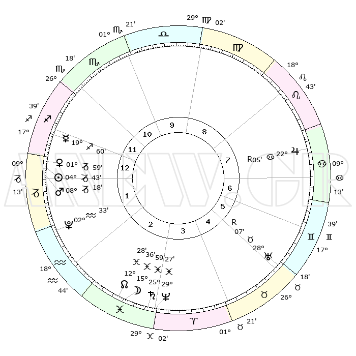 | | ΘΕΣΕΙΣ ΠΛΑΝΗΤΩΝ ΑΣΤΡΟΛΟΓΙΚΟΥ ΧΑΡΤΗ ΤΗΣ ΣΤΙΓΜΗΣ ΑΥΤΗΣ | | | | Πλανήτης | Ζώδιο | Μοίρες | Δεκαήμ. | Σε οίκο | Απόκλιση | | Ακμές των οίκων | | Ηλιος | Αιγόκερως | 04°38' | Πρώτο | 1 | 23 S 21 | | 1ος | 14°47' | Τοξότης | | Σελήνη | Ιχθείς | 14°37' | Δεύτερο | 3 | 05 S 47 | | 2ος | 18°25' | Αιγόκερως | | Ερμής | Τοξότης | 19°53' | Δεύτερο | 1 | 22 S 56 | | 3ος | 26°35' | Υδροχόος | | Αφροδίτη | Αιγόκερως | 01°53' | Πρώτο | 1 | 23 S 42 | | 4ος | 02°19' | Κριός | | Αρης | Αιγόκερως | 08°15' | Πρώτο | 1 | 24 S 02 | | 5ος | 01°10' | Ταύρος | | Δίας | Καρκίνος | 22°06'R | Τρίτο | 8 | 21 N 51 | | 6ος | 24°20' | Ταύρος | | Κρόνος | Ιχθείς | 25°58' | Τρίτο | 3 | 03 S 42 | | 7ος | 14°47' | Δίδυμοι | | Ουρανός | Ταύρος | 28°07'R | Τρίτο | 6 | 19 N 32 | | 8ος | 18°25' | Καρκίνος | | Ποσειδώνας | Ιχθείς | 29°27' | Τρίτο | 3 | 01 S 27 | | 9ος | 26°35' | Λέων | | Πλούτωνας | Υδροχόος | 02°33' | Πρώτο | 2 | 23 S 15 | | 10ος | 02°19' | Ζυγός | | Β. Δεσμός | Ιχθείς | 12°29' | Δεύτερο | 3 | 06 S 53 | | 11ος | 01°10' | Σκορπιός | | Ωροσκόπος | Τοξότης | 14°47' | Δεύτερο | | | 12ος | 24°20' | Σκορπιός | | Μεσουράνημα | Ζυγός | 02°19' | Πρώτο | | | |