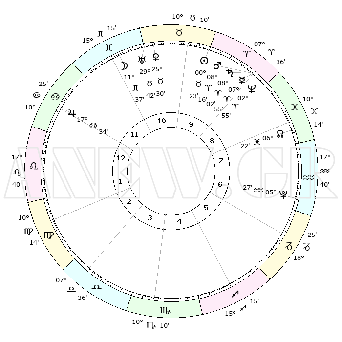 | | ΘΕΣΕΙΣ ΠΛΑΝΗΤΩΝ ΑΣΤΡΟΛΟΓΙΚΟΥ ΧΑΡΤΗ ΤΗΣ ΣΤΙΓΜΗΣ ΑΥΤΗΣ | | | | Πλανήτης | Ζώδιο | Μοίρες | Δεκαήμ. | Σε οίκο | Απόκλιση | | Ακμές των οίκων | | Ηλιος | Ταύρος | 00°20' | Πρώτο | 10 | 11 N 35 | | 1ος | 29°44' | Καρκίνος | | Σελήνη | Δίδυμοι | 10°42' | Δεύτερο | 11 | 27 N 05 | | 2ος | 20°45' | Λέων | | Ερμής | Κριός | 07°49' | Πρώτο | 9 | 00 N 42 | | 3ος | 15°46' | Παρθένος | | Αφροδίτη | Ταύρος | 25°25' | Τρίτο | 11 | 19 N 31 | | 4ος | 16°46' | Ζυγός | | Αρης | Κριός | 08°13' | Πρώτο | 9 | 02 N 23 | | 5ος | 22°49' | Σκορπιός | | Δίας | Καρκίνος | 17°34' | Δεύτερο | 12 | 22 N 40 | | 6ος | 28°34' | Τοξότης | | Κρόνος | Κριός | 08°02' | Πρώτο | 9 | 01 N 12 | | 7ος | 29°44' | Αιγόκερως | | Ουρανός | Ταύρος | 29°42' | Τρίτο | 11 | 19 N 55 | | 8ος | 20°45' | Υδροχόος | | Ποσειδώνας | Κριός | 02°55' | Πρώτο | 9 | 00 S 03 | | 9ος | 15°46' | Ιχθείς | | Πλούτωνας | Υδροχόος | 05°27' | Πρώτο | 7 | 22 S 48 | | 10ος | 16°46' | Κριός | | Β. Δεσμός | Ιχθείς | 06°23' | Πρώτο | 8 | 09 S 10 | | 11ος | 22°49' | Ταύρος | | Ωροσκόπος | Καρκίνος | 29°44' | Τρίτο | | | 12ος | 28°34' | Δίδυμοι | | Μεσουράνημα | Κριός | 16°46' | Δεύτερο | | | |