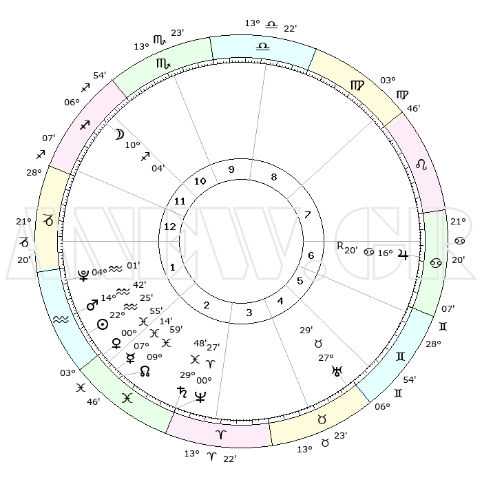 | | ΘΕΣΕΙΣ ΠΛΑΝΗΤΩΝ ΑΣΤΡΟΛΟΓΙΚΟΥ ΧΑΡΤΗ ΤΗΣ ΣΤΙΓΜΗΣ ΑΥΤΗΣ | | | | Πλανήτης | Ζώδιο | Μοίρες | Δεκαήμ. | Σε οίκο | Απόκλιση | | Ακμές των οίκων | | Ηλιος | Υδροχόος | 22°21' | Τρίτο | 2 | 14 S 04 | | 1ος | 24°42' | Τοξότης | | Σελήνη | Τοξότης | 09°10' | Πρώτο | 12 | 27 S 01 | | 2ος | 00°33' | Υδροχόος | | Ερμής | Ιχθείς | 07°06' | Πρώτο | 2 | 09 S 34 | | 3ος | 10°04' | Ιχθείς | | Αφροδίτη | Ιχθείς | 00°49' | Πρώτο | 2 | 12 S 32 | | 4ος | 14°47' | Κριός | | Αρης | Υδροχόος | 14°39' | Δεύτερο | 2 | 17 S 28 | | 5ος | 11°58' | Ταύρος | | Δίας | Καρκίνος | 16°21'R | Δεύτερο | 7 | 22 N 45 | | 6ος | 04°10' | Δίδυμοι | | Κρόνος | Ιχθείς | 29°48' | Τρίτο | 3 | 02 S 03 | | 7ος | 24°42' | Δίδυμοι | | Ουρανός | Ταύρος | 27°29' | Τρίτο | 5 | 19 N 25 | | 8ος | 00°33' | Λέων | | Ποσειδώνας | Κριός | 00°27' | Πρώτο | 3 | 01 S 02 | | 9ος | 10°04' | Παρθένος | | Πλούτωνας | Υδροχόος | 04°01' | Πρώτο | 2 | 22 S 58 | | 10ος | 14°47' | Ζυγός | | Β. Δεσμός | Ιχθείς | 09°60' | Πρώτο | 2 | 07 S 49 | | 11ος | 11°58' | Σκορπιός | | Ωροσκόπος | Τοξότης | 24°42' | Τρίτο | | | 12ος | 04°10' | Τοξότης | | Μεσουράνημα | Ζυγός | 14°47' | Δεύτερο | | | |