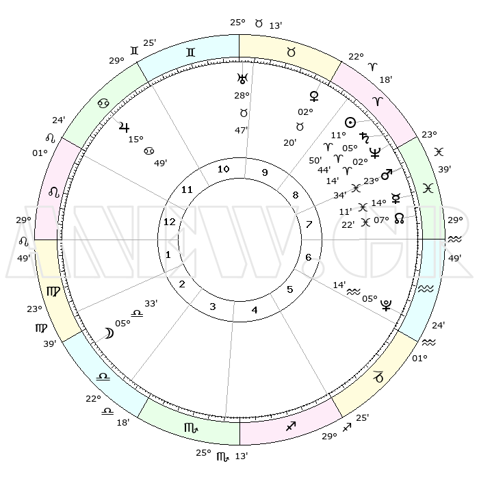 | | ΘΕΣΕΙΣ ΠΛΑΝΗΤΩΝ ΑΣΤΡΟΛΟΓΙΚΟΥ ΧΑΡΤΗ ΤΗΣ ΣΤΙΓΜΗΣ ΑΥΤΗΣ | | | | Πλανήτης | Ζώδιο | Μοίρες | Δεκαήμ. | Σε οίκο | Απόκλιση | | Ακμές των οίκων | | Ηλιος | Κριός | 11°46' | Δεύτερο | 9 | 04 N 39 | | 1ος | 10°06' | Λέων | | Σελήνη | Ζυγός | 04°41' | Πρώτο | 3 | 03 S 57 | | 2ος | 01°56' | Παρθένος | | Ερμής | Ιχθείς | 14°07' | Δεύτερο | 8 | 07 S 31 | | 3ος | 28°20' | Παρθένος | | Αφροδίτη | Ταύρος | 02°15' | Πρώτο | 10 | 11 N 51 | | 4ος | 00°25' | Σκορπιός | | Αρης | Ιχθείς | 23°30' | Τρίτο | 8 | 03 S 32 | | 5ος | 06°01' | Τοξότης | | Δίας | Καρκίνος | 15°49' | Δεύτερο | 12 | 22 N 52 | | 6ος | 10°09' | Αιγόκερως | | Κρόνος | Κριός | 05°43' | Πρώτο | 9 | 00 N 19 | | 7ος | 10°06' | Υδροχόος | | Ουρανός | Ταύρος | 28°47' | Τρίτο | 10 | 19 N 43 | | 8ος | 01°56' | Ιχθείς | | Ποσειδώνας | Κριός | 02°14' | Πρώτο | 9 | 00 S 19 | | 9ος | 28°20' | Ιχθείς | | Πλούτωνας | Υδροχόος | 05°14' | Πρώτο | 6 | 22 S 47 | | 10ος | 00°25' | Ταύρος | | Β. Δεσμός | Ιχθείς | 07°23' | Πρώτο | 8 | 08 S 48 | | 11ος | 06°01' | Δίδυμοι | | Ωροσκόπος | Λέων | 10°06' | Δεύτερο | | | 12ος | 10°09' | Καρκίνος | | Μεσουράνημα | Ταύρος | 00°25' | Πρώτο | | | |