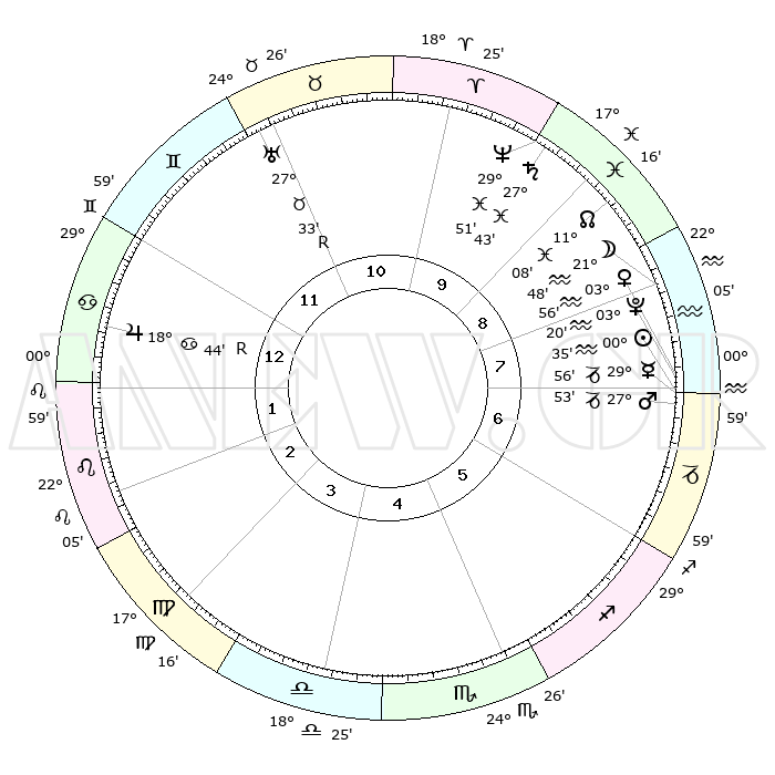| | ΘΕΣΕΙΣ ΠΛΑΝΗΤΩΝ ΑΣΤΡΟΛΟΓΙΚΟΥ ΧΑΡΤΗ ΤΗΣ ΣΤΙΓΜΗΣ ΑΥΤΗΣ | | | | Πλανήτης | Ζώδιο | Μοίρες | Δεκαήμ. | Σε οίκο | Απόκλιση | | Ακμές των οίκων | | Ηλιος | Υδροχόος | 00°30' | Πρώτο | 8 | 20 S 02 | | 1ος | 02°10' | Καρκίνος | | Σελήνη | Υδροχόος | 20°35' | Τρίτο | 9 | 16 S 13 | | 2ος | 22°51' | Καρκίνος | | Ερμής | Αιγόκερως | 29°46' | Τρίτο | 8 | 22 S 10 | | 3ος | 14°48' | Λέων | | Αφροδίτη | Υδροχόος | 03°49' | Πρώτο | 8 | 20 S 24 | | 4ος | 11°27' | Παρθένος | | Αρης | Αιγόκερως | 27°48' | Τρίτο | 8 | 21 S 34 | | 5ος | 15°44' | Ζυγός | | Δίας | Καρκίνος | 18°45'R | Δεύτερο | 1 | 22 N 24 | | 6ος | 25°34' | Σκορπιός | | Κρόνος | Ιχθείς | 27°42' | Τρίτο | 10 | 02 S 56 | | 7ος | 02°10' | Αιγόκερως | | Ουρανός | Ταύρος | 27°33'R | Τρίτο | 12 | 19 N 25 | | 8ος | 22°51' | Αιγόκερως | | Ποσειδώνας | Ιχθείς | 29°51' | Τρίτο | 10 | 01 S 16 | | 9ος | 14°48' | Υδροχόος | | Πλούτωνας | Υδροχόος | 03°20' | Πρώτο | 8 | 23 S 06 | | 10ος | 11°27' | Ιχθείς | | Β. Δεσμός | Ιχθείς | 11°08' | Δεύτερο | 9 | 07 S 23 | | 11ος | 15°44' | Κριός | | Ωροσκόπος | Καρκίνος | 02°10' | Πρώτο | | | 12ος | 25°34' | Ταύρος | | Μεσουράνημα | Ιχθείς | 11°27' | Δεύτερο | | | |