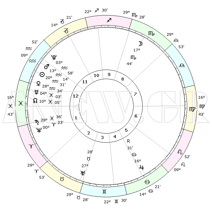 | | ΘΕΣΕΙΣ ΠΛΑΝΗΤΩΝ ΑΣΤΡΟΛΟΓΙΚΟΥ ΧΑΡΤΗ ΤΗΣ ΣΤΙΓΜΗΣ ΑΥΤΗΣ | | | | Πλανήτης | Ζώδιο | Μοίρες | Δεκαήμ. | Σε οίκο | Απόκλιση | | Ακμές των οίκων | | Ηλιος | Υδροχόος | 20°27' | Τρίτο | 1 | 14 S 40 | | 1ος | 15°02' | Υδροχόος | | Σελήνη | Σκορπιός | 17°02' | Δεύτερο | 9 | 21 S 35 | | 2ος | 00°44' | Κριός | | Ερμής | Ιχθείς | 03°57' | Πρώτο | 1 | 11 S 01 | | 3ος | 06°27' | Ταύρος | | Αφροδίτη | Υδροχόος | 28°29' | Τρίτο | 1 | 13 S 21 | | 4ος | 02°35' | Δίδυμοι | | Αρης | Υδροχόος | 13°11' | Δεύτερο | 12 | 17 S 53 | | 5ος | 24°33' | Δίδυμοι | | Δίας | Καρκίνος | 16°31'R | Δεύτερο | 5 | 22 N 44 | | 6ος | 16°48' | Καρκίνος | | Κρόνος | Ιχθείς | 29°36' | Τρίτο | 1 | 02 S 08 | | 7ος | 15°02' | Λέων | | Ουρανός | Ταύρος | 27°28' | Τρίτο | 3 | 19 N 24 | | 8ος | 00°44' | Ζυγός | | Ποσειδώνας | Κριός | 00°23' | Πρώτο | 1 | 01 S 03 | | 9ος | 06°27' | Σκορπιός | | Πλούτωνας | Υδροχόος | 03°58' | Πρώτο | 12 | 22 S 58 | | 10ος | 02°35' | Τοξότης | | Β. Δεσμός | Ιχθείς | 10°06' | Δεύτερο | 1 | 07 S 47 | | 11ος | 24°33' | Τοξότης | | Ωροσκόπος | Υδροχόος | 15°02' | Δεύτερο | | | 12ος | 16°48' | Αιγόκερως | | Μεσουράνημα | Τοξότης | 02°35' | Πρώτο | | | |