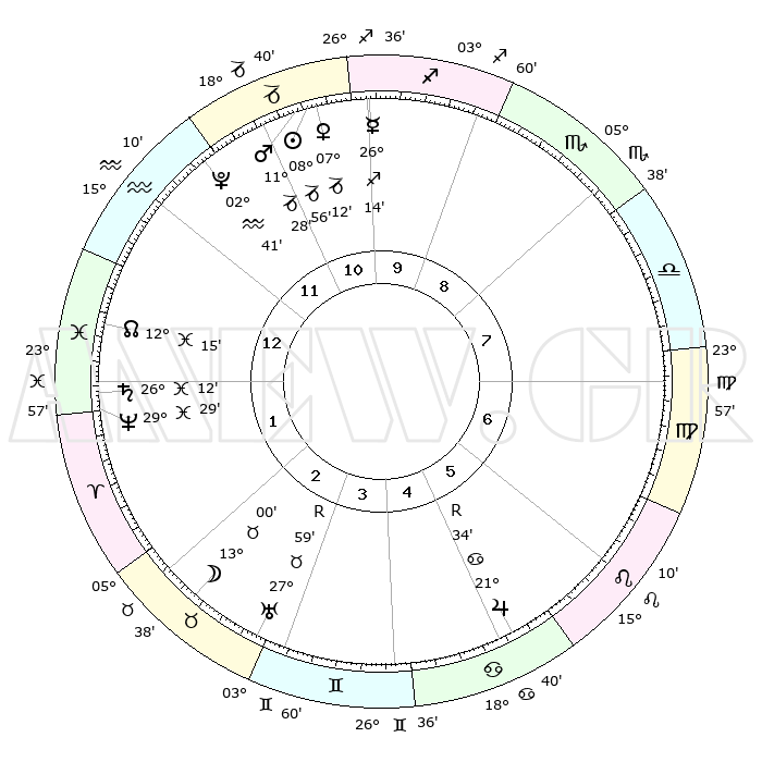 | | ΘΕΣΕΙΣ ΠΛΑΝΗΤΩΝ ΑΣΤΡΟΛΟΓΙΚΟΥ ΧΑΡΤΗ ΤΗΣ ΣΤΙΓΜΗΣ ΑΥΤΗΣ | | | | Πλανήτης | Ζώδιο | Μοίρες | Δεκαήμ. | Σε οίκο | Απόκλιση | | Ακμές των οίκων | | Ηλιος | Αιγόκερως | 08°52' | Πρώτο | 11 | 23 S 08 | | 1ος | 17°00' | Υδροχόος | | Σελήνη | Ταύρος | 12°01' | Δεύτερο | 3 | 19 N 39 | | 2ος | 02°46' | Κριός | | Ερμής | Τοξότης | 26°08' | Τρίτο | 11 | 23 S 46 | | 3ος | 08°05' | Ταύρος | | Αφροδίτη | Αιγόκερως | 07°07' | Πρώτο | 11 | 23 S 41 | | 4ος | 03°58' | Δίδυμοι | | Αρης | Αιγόκερως | 11°25' | Δεύτερο | 11 | 23 S 49 | | 5ος | 25°52' | Δίδυμοι | | Δίας | Καρκίνος | 21°34'R | Τρίτο | 6 | 21 N 56 | | 6ος | 18°16' | Καρκίνος | | Κρόνος | Ιχθείς | 26°11' | Τρίτο | 1 | 03 S 36 | | 7ος | 17°00' | Λέων | | Ουρανός | Ταύρος | 27°59'R | Τρίτο | 3 | 19 N 31 | | 8ος | 02°46' | Ζυγός | | Ποσειδώνας | Ιχθείς | 29°29' | Τρίτο | 1 | 01 S 26 | | 9ος | 08°05' | Σκορπιός | | Πλούτωνας | Υδροχόος | 02°40' | Πρώτο | 12 | 23 S 14 | | 10ος | 03°58' | Τοξότης | | Β. Δεσμός | Ιχθείς | 12°15' | Δεύτερο | 1 | 06 S 58 | | 11ος | 25°52' | Τοξότης | | Ωροσκόπος | Υδροχόος | 17°00' | Δεύτερο | | | 12ος | 18°16' | Αιγόκερως | | Μεσουράνημα | Τοξότης | 03°58' | Πρώτο | | | |