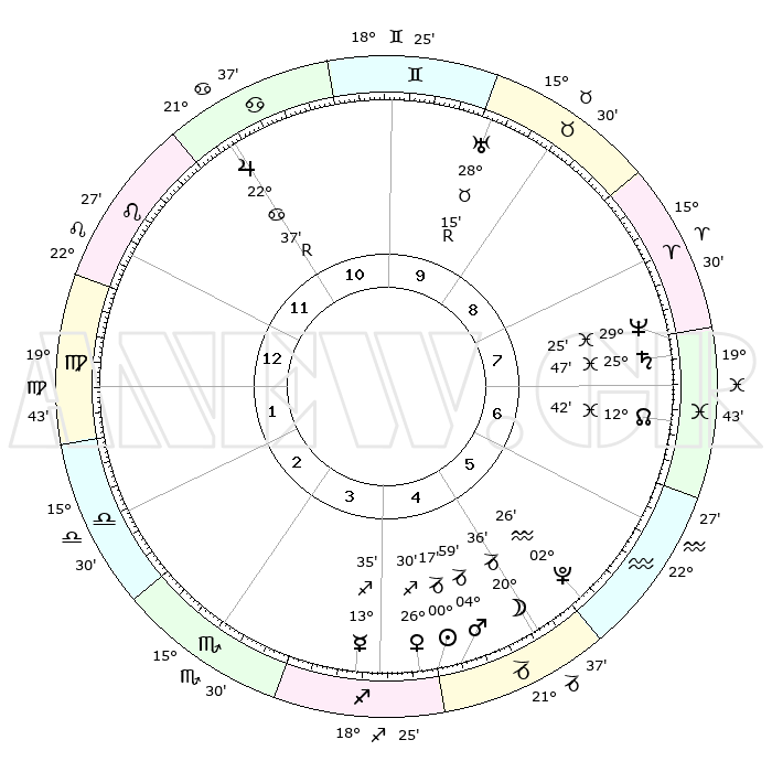 | | ΘΕΣΕΙΣ ΠΛΑΝΗΤΩΝ ΑΣΤΡΟΛΟΓΙΚΟΥ ΧΑΡΤΗ ΤΗΣ ΣΤΙΓΜΗΣ ΑΥΤΗΣ | | | | Πλανήτης | Ζώδιο | Μοίρες | Δεκαήμ. | Σε οίκο | Απόκλιση | | Ακμές των οίκων | | Ηλιος | Αιγόκερως | 00°13' | Πρώτο | 4 | 23 S 26 | | 1ος | 01°49' | Παρθένος | | Σελήνη | Αιγόκερως | 19°51' | Δεύτερο | 5 | 25 S 52 | | 2ος | 25°51' | Παρθένος | | Ερμής | Τοξότης | 13°30' | Δεύτερο | 4 | 21 S 46 | | 3ος | 24°41' | Ζυγός | | Αφροδίτη | Τοξότης | 26°26' | Τρίτο | 4 | 23 S 30 | | 4ος | 27°37' | Σκορπιός | | Αρης | Αιγόκερως | 04°57' | Πρώτο | 5 | 24 S 10 | | 5ος | 01°42' | Αιγόκερως | | Δίας | Καρκίνος | 22°37'R | Τρίτο | 11 | 21 N 45 | | 6ος | 03°31' | Υδροχόος | | Κρόνος | Ιχθείς | 25°47' | Τρίτο | 7 | 03 S 47 | | 7ος | 01°49' | Ιχθείς | | Ουρανός | Ταύρος | 28°15'R | Τρίτο | 10 | 19 N 34 | | 8ος | 25°51' | Ιχθείς | | Ποσειδώνας | Ιχθείς | 29°25' | Τρίτο | 8 | 01 S 28 | | 9ος | 24°41' | Κριός | | Πλούτωνας | Υδροχόος | 02°26' | Πρώτο | 5 | 23 S 17 | | 10ος | 27°37' | Ταύρος | | Β. Δεσμός | Ιχθείς | 12°42' | Δεύτερο | 7 | 06 S 47 | | 11ος | 01°42' | Καρκίνος | | Ωροσκόπος | Παρθένος | 01°49' | Πρώτο | | | 12ος | 03°31' | Λέων | | Μεσουράνημα | Ταύρος | 27°37' | Τρίτο | | | |