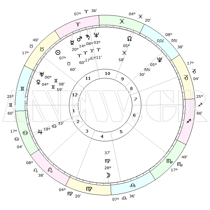 | | ΘΕΣΕΙΣ ΠΛΑΝΗΤΩΝ ΑΣΤΡΟΛΟΓΙΚΟΥ ΧΑΡΤΗ ΤΗΣ ΣΤΙΓΜΗΣ ΑΥΤΗΣ | | | | Πλανήτης | Ζώδιο | Μοίρες | Δεκαήμ. | Σε οίκο | Απόκλιση | | Ακμές των οίκων | | Ηλιος | Ταύρος | 07°57' | Πρώτο | 12 | 14 N 09 | | 1ος | 05°43' | Δίδυμοι | | Σελήνη | Παρθένος | 27°55' | Τρίτο | 5 | 00 S 49 | | 2ος | 29°27' | Δίδυμοι | | Ερμής | Κριός | 20°54' | Τρίτο | 11 | 06 N 07 | | 3ος | 20°42' | Καρκίνος | | Αφροδίτη | Δίδυμοι | 04°55' | Πρώτο | 12 | 21 N 52 | | 4ος | 13°56' | Λέων | | Αρης | Κριός | 14°15' | Δεύτερο | 11 | 04 N 47 | | 5ος | 13°25' | Παρθένος | | Δίας | Καρκίνος | 18°32' | Δεύτερο | 2 | 22 N 32 | | 6ος | 22°41' | Ζυγός | | Κρόνος | Κριός | 08°57' | Πρώτο | 11 | 01 N 33 | | 7ος | 05°43' | Τοξότης | | Ουρανός | Δίδυμοι | 00°07' | Πρώτο | 12 | 20 N 01 | | 8ος | 29°27' | Τοξότης | | Ποσειδώνας | Κριός | 03°11' | Πρώτο | 11 | 00 N 03 | | 9ος | 20°42' | Αιγόκερως | | Πλούτωνας | Υδροχόος | 05°30' | Πρώτο | 9 | 22 S 48 | | 10ος | 13°56' | Υδροχόος | | Β. Δεσμός | Ιχθείς | 05°58' | Πρώτο | 10 | 09 S 19 | | 11ος | 13°25' | Ιχθείς | | Ωροσκόπος | Δίδυμοι | 05°43' | Πρώτο | | | 12ος | 22°41' | Κριός | | Μεσουράνημα | Υδροχόος | 13°56' | Δεύτερο | | | |