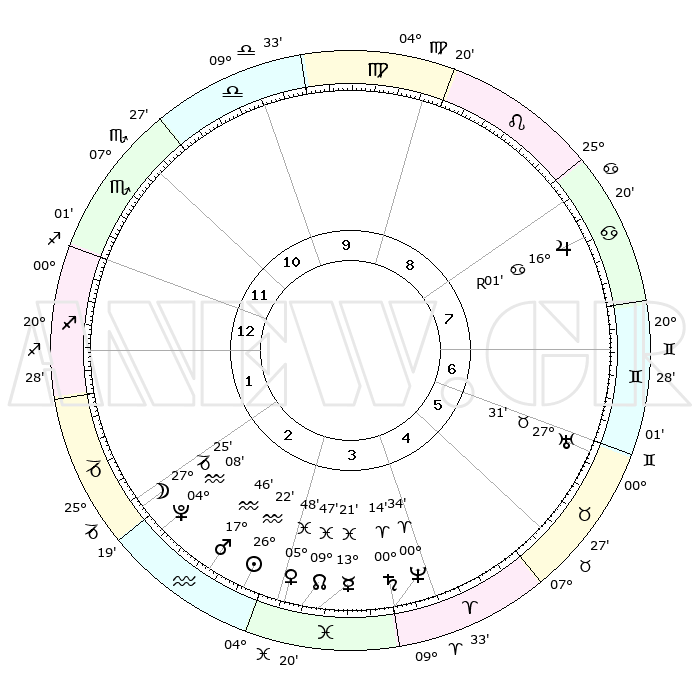 | | ΘΕΣΕΙΣ ΠΛΑΝΗΤΩΝ ΑΣΤΡΟΛΟΓΙΚΟΥ ΧΑΡΤΗ ΤΗΣ ΣΤΙΓΜΗΣ ΑΥΤΗΣ | | | | Πλανήτης | Ζώδιο | Μοίρες | Δεκαήμ. | Σε οίκο | Απόκλιση | | Ακμές των οίκων | | Ηλιος | Υδροχόος | 25°46' | Τρίτο | 9 | 12 S 56 | | 1ος | 26°42' | Δίδυμοι | | Σελήνη | Αιγόκερως | 20°06' | Τρίτο | 8 | 25 S 51 | | 2ος | 17°43' | Καρκίνος | | Ερμής | Ιχθείς | 12°29' | Δεύτερο | 10 | 06 S 56 | | 3ος | 09°19' | Λέων | | Αφροδίτη | Ιχθείς | 05°04' | Πρώτο | 9 | 11 S 01 | | 4ος | 05°07' | Παρθένος | | Αρης | Υδροχόος | 17°19' | Δεύτερο | 9 | 16 S 40 | | 5ος | 08°31' | Ζυγός | | Δίας | Καρκίνος | 16°04'R | Δεύτερο | 1 | 22 N 47 | | 6ος | 18°42' | Σκορπιός | | Κρόνος | Κριός | 00°10' | Πρώτο | 10 | 01 S 54 | | 7ος | 26°42' | Τοξότης | | Ουρανός | Ταύρος | 27°30' | Τρίτο | 12 | 19 N 25 | | 8ος | 17°43' | Αιγόκερως | | Ποσειδώνας | Κριός | 00°33' | Πρώτο | 10 | 00 S 59 | | 9ος | 09°19' | Υδροχόος | | Πλούτωνας | Υδροχόος | 04°07' | Πρώτο | 8 | 22 S 57 | | 10ος | 05°07' | Ιχθείς | | Β. Δεσμός | Ιχθείς | 09°49' | Πρώτο | 10 | 07 S 53 | | 11ος | 08°31' | Κριός | | Ωροσκόπος | Δίδυμοι | 26°42' | Τρίτο | | | 12ος | 18°42' | Ταύρος | | Μεσουράνημα | Ιχθείς | 05°07' | Πρώτο | | | |