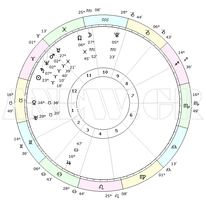 | | ΘΕΣΕΙΣ ΠΛΑΝΗΤΩΝ ΑΣΤΡΟΛΟΓΙΚΟΥ ΧΑΡΤΗ ΤΗΣ ΣΤΙΓΜΗΣ ΑΥΤΗΣ | | | | Πλανήτης | Ζώδιο | Μοίρες | Δεκαήμ. | Σε οίκο | Απόκλιση | | Ακμές των οίκων | | Ηλιος | Κριός | 23°13' | Τρίτο | 1 | 09 N 01 | | 1ος | 06°12' | Κριός | | Σελήνη | Υδροχόος | 26°54' | Τρίτο | 12 | 13 S 29 | | 2ος | 14°56' | Ταύρος | | Ερμής | Ιχθείς | 27°15' | Τρίτο | 12 | 03 S 24 | | 3ος | 11°25' | Δίδυμοι | | Αφροδίτη | Ταύρος | 16°33' | Δεύτερο | 2 | 16 N 52 | | 4ος | 03°29' | Καρκίνος | | Αρης | Κριός | 02°36' | Πρώτο | 12 | 00 N 07 | | 5ος | 26°05' | Καρκίνος | | Δίας | Καρκίνος | 16°47' | Δεύτερο | 4 | 22 N 45 | | 6ος | 24°28' | Λέων | | Κρόνος | Κριός | 07°09' | Πρώτο | 1 | 00 N 52 | | 7ος | 06°12' | Ζυγός | | Ουρανός | Ταύρος | 29°20' | Τρίτο | 2 | 19 N 50 | | 8ος | 14°56' | Σκορπιός | | Ποσειδώνας | Κριός | 02°39' | Πρώτο | 12 | 00 S 09 | | 9ος | 11°25' | Τοξότης | | Πλούτωνας | Υδροχόος | 05°23' | Πρώτο | 11 | 22 S 47 | | 10ος | 03°29' | Αιγόκερως | | Β. Δεσμός | Ιχθείς | 06°46' | Πρώτο | 12 | 09 S 02 | | 11ος | 26°05' | Αιγόκερως | | Ωροσκόπος | Κριός | 06°12' | Πρώτο | | | 12ος | 24°28' | Υδροχόος | | Μεσουράνημα | Αιγόκερως | 03°29' | Πρώτο | | | |