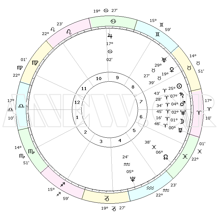 | | ΘΕΣΕΙΣ ΠΛΑΝΗΤΩΝ ΑΣΤΡΟΛΟΓΙΚΟΥ ΧΑΡΤΗ ΤΗΣ ΣΤΙΓΜΗΣ ΑΥΤΗΣ | | | | Πλανήτης | Ζώδιο | Μοίρες | Δεκαήμ. | Σε οίκο | Απόκλιση | | Ακμές των οίκων | | Ηλιος | Κριός | 25°39' | Τρίτο | 8 | 09 N 55 | | 1ος | 27°57' | Παρθένος | | Σελήνη | Κριός | 00°21' | Πρώτο | 7 | 01 N 56 | | 2ος | 24°23' | Ζυγός | | Ερμής | Κριός | 00°41' | Πρώτο | 7 | 02 S 07 | | 3ος | 24°44' | Σκορπιός | | Αφροδίτη | Ταύρος | 19°35' | Δεύτερο | 8 | 17 N 49 | | 4ος | 27°41' | Τοξότης | | Αρης | Κριός | 04°31' | Πρώτο | 7 | 00 N 54 | | 5ος | 00°42' | Υδροχόος | | Δίας | Καρκίνος | 17°02' | Δεύτερο | 10 | 22 N 44 | | 6ος | 01°12' | Ιχθείς | | Κρόνος | Κριός | 07°27' | Πρώτο | 7 | 00 N 59 | | 7ος | 27°57' | Ιχθείς | | Ουρανός | Ταύρος | 29°27' | Τρίτο | 9 | 19 N 52 | | 8ος | 24°23' | Κριός | | Ποσειδώνας | Κριός | 02°45' | Πρώτο | 7 | 00 S 07 | | 9ος | 24°44' | Ταύρος | | Πλούτωνας | Υδροχόος | 05°24' | Πρώτο | 5 | 22 S 47 | | 10ος | 27°41' | Δίδυμοι | | Β. Δεσμός | Ιχθείς | 06°38' | Πρώτο | 6 | 09 S 05 | | 11ος | 00°42' | Λέων | | Ωροσκόπος | Παρθένος | 27°57' | Τρίτο | | | 12ος | 01°12' | Παρθένος | | Μεσουράνημα | Δίδυμοι | 27°41' | Τρίτο | | | |
