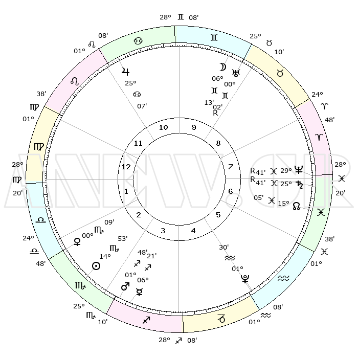 | | ΘΕΣΕΙΣ ΠΛΑΝΗΤΩΝ ΑΣΤΡΟΛΟΓΙΚΟΥ ΧΑΡΤΗ ΤΗΣ ΣΤΙΓΜΗΣ ΑΥΤΗΣ | | | | Πλανήτης | Ζώδιο | Μοίρες | Δεκαήμ. | Σε οίκο | Απόκλιση | | Ακμές των οίκων | | Ηλιος | Σκορπιός | 14°48' | Δεύτερο | 3 | 16 S 16 | | 1ος | 02°38' | Παρθένος | | Σελήνη | Δίδυμοι | 04°53' | Πρώτο | 10 | 25 N 59 | | 2ος | 26°46' | Παρθένος | | Ερμής | Τοξότης | 06°19' | Πρώτο | 4 | 24 S 00 | | 3ος | 25°40' | Ζυγός | | Αφροδίτη | Σκορπιός | 00°02' | Πρώτο | 3 | 10 S 11 | | 4ος | 28°37' | Σκορπιός | | Αρης | Τοξότης | 01°45' | Πρώτο | 4 | 20 S 57 | | 5ος | 02°38' | Αιγόκερως | | Δίας | Καρκίνος | 25°07' | Τρίτο | 11 | 21 N 12 | | 6ος | 04°23' | Υδροχόος | | Κρόνος | Ιχθείς | 25°41'R | Τρίτο | 7 | 03 S 58 | | 7ος | 02°38' | Ιχθείς | | Ουρανός | Δίδυμοι | 00°02'R | Πρώτο | 10 | 19 N 57 | | 8ος | 26°46' | Ιχθείς | | Ποσειδώνας | Ιχθείς | 29°41'R | Τρίτο | 8 | 01 S 23 | | 9ος | 25°40' | Κριός | | Πλούτωνας | Υδροχόος | 01°30' | Πρώτο | 5 | 23 S 30 | | 10ος | 28°37' | Ταύρος | | Β. Δεσμός | Ιχθείς | 15°05' | Δεύτερο | 7 | 05 S 53 | | 11ος | 02°38' | Καρκίνος | | Ωροσκόπος | Παρθένος | 02°38' | Πρώτο | | | 12ος | 04°23' | Λέων | | Μεσουράνημα | Ταύρος | 28°37' | Τρίτο | | | |