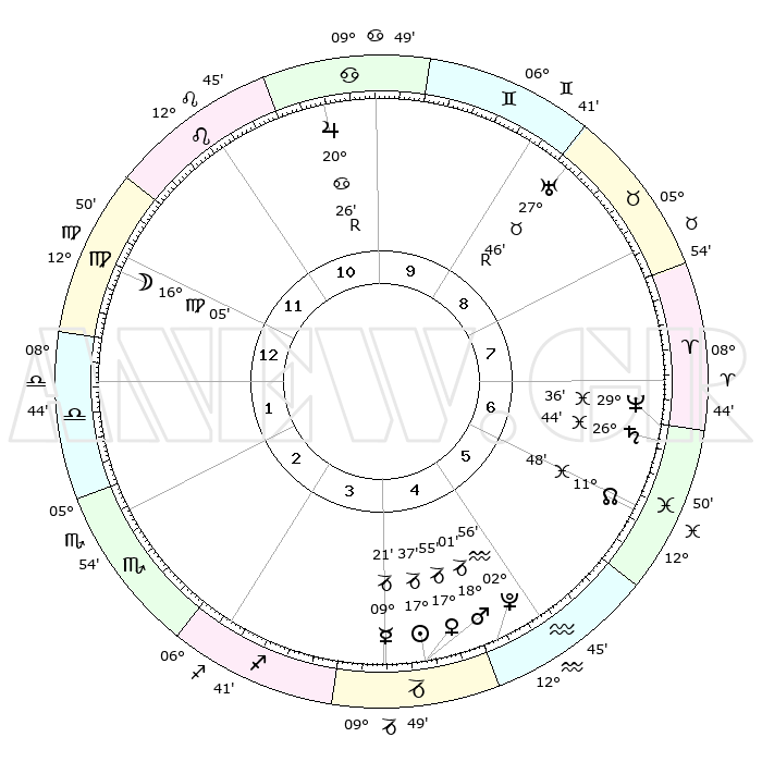 | | ΘΕΣΕΙΣ ΠΛΑΝΗΤΩΝ ΑΣΤΡΟΛΟΓΙΚΟΥ ΧΑΡΤΗ ΤΗΣ ΣΤΙΓΜΗΣ ΑΥΤΗΣ | | | | Πλανήτης | Ζώδιο | Μοίρες | Δεκαήμ. | Σε οίκο | Απόκλιση | | Ακμές των οίκων | | Ηλιος | Αιγόκερως | 16°29' | Δεύτερο | 5 | 22 S 25 | | 1ος | 05°02' | Παρθένος | | Σελήνη | Παρθένος | 01°20' | Πρώτο | 12 | 11 N 45 | | 2ος | 29°25' | Παρθένος | | Ερμής | Αιγόκερως | 07°37' | Πρώτο | 5 | 24 S 22 | | 3ος | 28°31' | Ζυγός | | Αφροδίτη | Αιγόκερως | 16°31' | Δεύτερο | 5 | 23 S 07 | | 4ος | 01°28' | Τοξότης | | Αρης | Αιγόκερως | 17°09' | Δεύτερο | 5 | 23 S 15 | | 5ος | 05°20' | Αιγόκερως | | Δίας | Καρκίνος | 20°35'R | Τρίτο | 11 | 22 N 06 | | 6ος | 06°55' | Υδροχόος | | Κρόνος | Ιχθείς | 26°39' | Τρίτο | 7 | 03 S 23 | | 7ος | 05°02' | Ιχθείς | | Ουρανός | Ταύρος | 27°48'R | Τρίτο | 9 | 19 N 28 | | 8ος | 29°25' | Ιχθείς | | Ποσειδώνας | Ιχθείς | 29°35' | Τρίτο | 8 | 01 S 23 | | 9ος | 28°31' | Κριός | | Πλούτωνας | Υδροχόος | 02°54' | Πρώτο | 5 | 23 S 11 | | 10ος | 01°28' | Δίδυμοι | | Β. Δεσμός | Ιχθείς | 11°52' | Δεύτερο | 7 | 07 S 07 | | 11ος | 05°20' | Καρκίνος | | Ωροσκόπος | Παρθένος | 05°02' | Πρώτο | | | 12ος | 06°55' | Λέων | | Μεσουράνημα | Δίδυμοι | 01°28' | Πρώτο | | | |