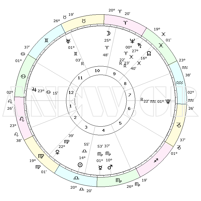 | ΘΕΣΕΙΣ ΠΛΑΝΗΤΩΝ ΑΣΤΡΟΛΟΓΙΚΟΥ ΧΑΡΤΗ ΤΗΣ ΣΤΙΓΜΗΣ ΑΥΤΗΣ | | Πλανήτης | Ζώδιο | Μοίρες | Δεκαήμ. | Σε οίκο | Απόκλιση | | Ακμές των οίκων | Ηλιος | Ζυγός | 14°49' | Δεύτερο | 4 | 05 S 50 | | 1ος | 04°14' | Καρκίνος | Σελήνη | Κριός | 24°24' | Τρίτο | 11 | 12 N 20 | | 2ος | 24°49' | Καρκίνος | Ερμής | Σκορπιός | 01°44' | Πρώτο | 5 | 12 S 56 | | 3ος | 16°55' | Λέων | Αφροδίτη | Παρθένος | 22°32' | Τρίτο | 4 | 04 N 16 | | 4ος | 13°56' | Παρθένος | Αρης | Σκορπιός | 10°34' | Δεύτερο | 5 | 15 S 08 | | 5ος | 18°30' | Ζυγός | Δίας | Καρκίνος | 23°15' | Τρίτο | 1 | 21 N 28 | | 6ος | 28°08' | Σκορπιός | Κρόνος | Ιχθείς | 27°23'R | Τρίτο | 10 | 03 S 21 | | 7ος | 04°14' | Αιγόκερως | Ουρανός | Δίδυμοι | 01°03'R | Πρώτο | 12 | 20 N 09 | | 8ος | 24°49' | Αιγόκερως | Ποσειδώνας | Κριός | 00°22'R | Πρώτο | 10 | 01 S 07 | | 9ος | 16°55' | Υδροχόος | Πλούτωνας | Υδροχόος | 01°22'R | Πρώτο | 8 | 23 S 32 | | 10ος | 13°56' | Ιχθείς | Β. Δεσμός | Ιχθείς | 16°41' | Δεύτερο | 10 | 05 S 15 | | 11ος | 18°30' | Κριός | Ωροσκόπος | Καρκίνος | 04°14' | Πρώτο | | | 12ος | 28°08' | Ταύρος | Μεσουράνημα | Ιχθείς | 13°56' | Δεύτερο | | | |