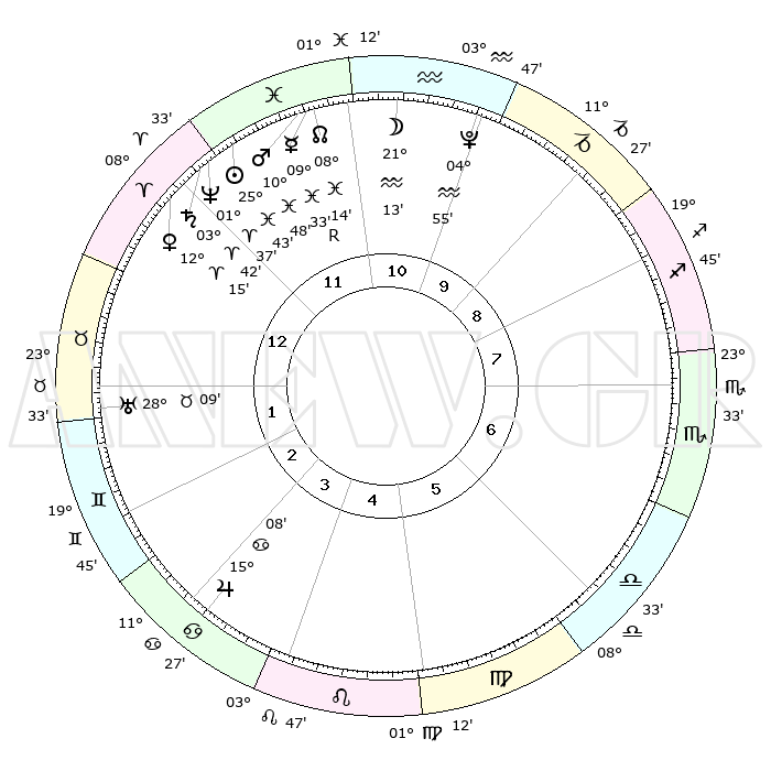 | | ΘΕΣΕΙΣ ΠΛΑΝΗΤΩΝ ΑΣΤΡΟΛΟΓΙΚΟΥ ΧΑΡΤΗ ΤΗΣ ΣΤΙΓΜΗΣ ΑΥΤΗΣ | | | | Πλανήτης | Ζώδιο | Μοίρες | Δεκαήμ. | Σε οίκο | Απόκλιση | | Ακμές των οίκων | | Ηλιος | Ιχθείς | 25°39' | Τρίτο | 12 | 01 S 44 | | 1ος | 19°50' | Κριός | | Σελήνη | Υδροχόος | 20°22' | Τρίτο | 11 | 16 S 18 | | 2ος | 24°53' | Ταύρος | | Ερμής | Ιχθείς | 09°34'R | Πρώτο | 12 | 06 S 01 | | 3ος | 19°34' | Δίδυμοι | | Αφροδίτη | Κριός | 12°10' | Δεύτερο | 12 | 03 N 53 | | 4ος | 11°18' | Καρκίνος | | Αρης | Ιχθείς | 10°45' | Δεύτερο | 12 | 08 S 32 | | 5ος | 04°48' | Λέων | | Δίας | Καρκίνος | 15°08' | Δεύτερο | 4 | 22 N 56 | | 6ος | 05°34' | Παρθένος | | Κρόνος | Κριός | 03°42' | Πρώτο | 12 | 00 S 29 | | 7ος | 19°50' | Ζυγός | | Ουρανός | Ταύρος | 28°09' | Τρίτο | 2 | 19 N 34 | | 8ος | 24°53' | Σκορπιός | | Ποσειδώνας | Κριός | 01°37' | Πρώτο | 12 | 00 S 33 | | 9ος | 19°34' | Τοξότης | | Πλούτωνας | Υδροχόος | 04°55' | Πρώτο | 11 | 22 S 49 | | 10ος | 11°18' | Αιγόκερως | | Β. Δεσμός | Ιχθείς | 08°14' | Πρώτο | 12 | 08 S 29 | | 11ος | 04°48' | Υδροχόος | | Ωροσκόπος | Κριός | 19°50' | Δεύτερο | | | 12ος | 05°34' | Ιχθείς | | Μεσουράνημα | Αιγόκερως | 11°18' | Δεύτερο | | | |