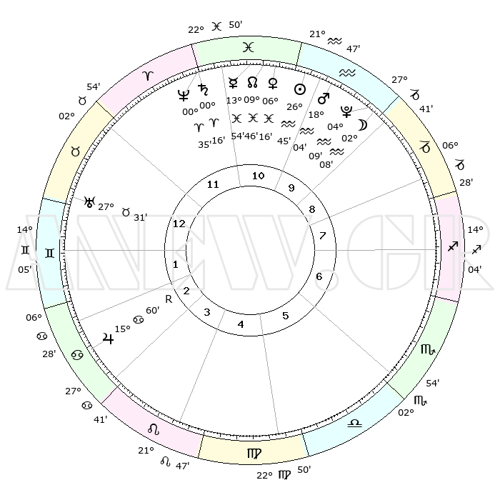 | | ΘΕΣΕΙΣ ΠΛΑΝΗΤΩΝ ΑΣΤΡΟΛΟΓΙΚΟΥ ΧΑΡΤΗ ΤΗΣ ΣΤΙΓΜΗΣ ΑΥΤΗΣ | | | | Πλανήτης | Ζώδιο | Μοίρες | Δεκαήμ. | Σε οίκο | Απόκλιση | | Ακμές των οίκων | | Ηλιος | Υδροχόος | 26°40' | Τρίτο | 11 | 12 S 37 | | 1ος | 14°46' | Ταύρος | | Σελήνη | Υδροχόος | 01°16' | Πρώτο | 10 | 23 S 01 | | 2ος | 13°04' | Δίδυμοι | | Ερμής | Ιχθείς | 13°48' | Δεύτερο | 11 | 06 S 15 | | 3ος | 05°19' | Καρκίνος | | Αφροδίτη | Ιχθείς | 06°11' | Πρώτο | 11 | 10 S 36 | | 4ος | 27°16' | Καρκίνος | | Αρης | Υδροχόος | 18°01' | Δεύτερο | 10 | 16 S 27 | | 5ος | 23°24' | Λέων | | Δίας | Καρκίνος | 15°60'R | Δεύτερο | 3 | 22 N 48 | | 6ος | 29°04' | Παρθένος | | Κρόνος | Κριός | 00°16' | Πρώτο | 12 | 01 S 52 | | 7ος | 14°46' | Σκορπιός | | Ουρανός | Ταύρος | 27°31' | Τρίτο | 1 | 19 N 25 | | 8ος | 13°04' | Τοξότης | | Ποσειδώνας | Κριός | 00°35' | Πρώτο | 12 | 00 S 58 | | 9ος | 05°19' | Αιγόκερως | | Πλούτωνας | Υδροχόος | 04°09' | Πρώτο | 10 | 22 S 56 | | 10ος | 27°16' | Αιγόκερως | | Β. Δεσμός | Ιχθείς | 09°46' | Πρώτο | 11 | 07 S 54 | | 11ος | 23°24' | Υδροχόος | | Ωροσκόπος | Ταύρος | 14°46' | Δεύτερο | | | 12ος | 29°04' | Ιχθείς | | Μεσουράνημα | Αιγόκερως | 27°16' | Τρίτο | | | |