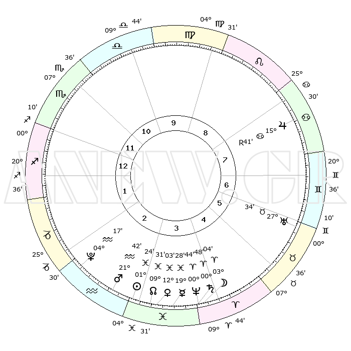 | | ΘΕΣΕΙΣ ΠΛΑΝΗΤΩΝ ΑΣΤΡΟΛΟΓΙΚΟΥ ΧΑΡΤΗ ΤΗΣ ΣΤΙΓΜΗΣ ΑΥΤΗΣ | | | | Πλανήτης | Ζώδιο | Μοίρες | Δεκαήμ. | Σε οίκο | Απόκλιση | | Ακμές των οίκων | | Ηλιος | Ιχθείς | 01°19' | Πρώτο | 3 | 11 S 00 | | 1ος | 27°42' | Σκορπιός | | Σελήνη | Κριός | 02°01' | Πρώτο | 4 | 02 N 43 | | 2ος | 28°31' | Τοξότης | | Ερμής | Ιχθείς | 19°24' | Δεύτερο | 4 | 03 S 03 | | 3ος | 03°51' | Υδροχόος | | Αφροδίτη | Ιχθείς | 11°57' | Δεύτερο | 4 | 08 S 25 | | 4ος | 09°50' | Ιχθείς | | Αρης | Υδροχόος | 21°38' | Τρίτο | 3 | 15 S 19 | | 5ος | 11°08' | Κριός | | Δίας | Καρκίνος | 15°41'R | Δεύτερο | 8 | 22 N 51 | | 6ος | 06°30' | Ταύρος | | Κρόνος | Κριός | 00°47' | Πρώτο | 4 | 01 S 39 | | 7ος | 27°42' | Ταύρος | | Ουρανός | Ταύρος | 27°34' | Τρίτο | 6 | 19 N 26 | | 8ος | 28°31' | Δίδυμοι | | Ποσειδώνας | Κριός | 00°44' | Πρώτο | 4 | 00 S 55 | | 9ος | 03°51' | Λέων | | Πλούτωνας | Υδροχόος | 04°17' | Πρώτο | 3 | 22 S 55 | | 10ος | 09°50' | Παρθένος | | Β. Δεσμός | Ιχθείς | 09°31' | Πρώτο | 3 | 08 S 00 | | 11ος | 11°08' | Ζυγός | | Ωροσκόπος | Σκορπιός | 27°42' | Τρίτο | | | 12ος | 06°30' | Σκορπιός | | Μεσουράνημα | Παρθένος | 09°50' | Πρώτο | | | |