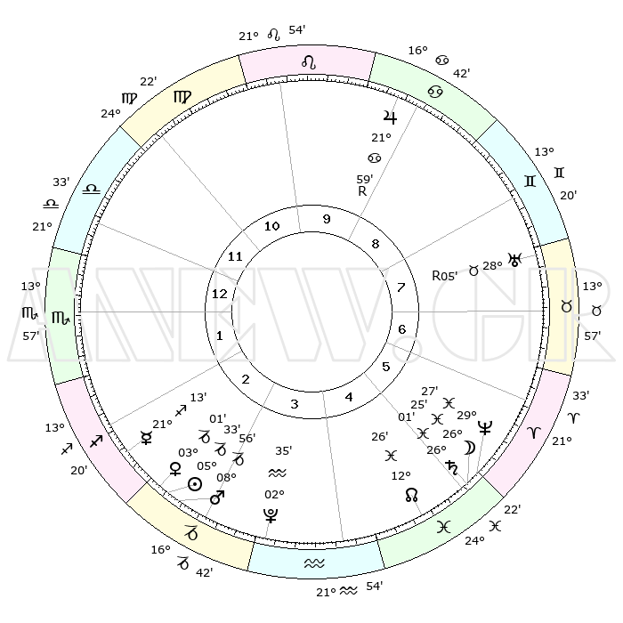 | | ΘΕΣΕΙΣ ΠΛΑΝΗΤΩΝ ΑΣΤΡΟΛΟΓΙΚΟΥ ΧΑΡΤΗ ΤΗΣ ΣΤΙΓΜΗΣ ΑΥΤΗΣ | | | | Πλανήτης | Ζώδιο | Μοίρες | Δεκαήμ. | Σε οίκο | Απόκλιση | | Ακμές των οίκων | | Ηλιος | Αιγόκερως | 05°28' | Πρώτο | 3 | 23 S 19 | | 1ος | 21°20' | Ζυγός | | Σελήνη | Ιχθείς | 25°23' | Τρίτο | 5 | 00 S 42 | | 2ος | 19°15' | Σκορπιός | | Ερμής | Τοξότης | 21°06' | Τρίτο | 3 | 23 S 07 | | 3ος | 20°37' | Τοξότης | | Αφροδίτη | Αιγόκερως | 02°55' | Πρώτο | 3 | 23 S 43 | | 4ος | 24°17' | Αιγόκερως | | Αρης | Αιγόκερως | 08°52' | Πρώτο | 3 | 24 S 00 | | 5ος | 27°14' | Υδροχόος | | Δίας | Καρκίνος | 21°60'R | Τρίτο | 9 | 21 N 52 | | 6ος | 26°36' | Ιχθείς | | Κρόνος | Ιχθείς | 26°01' | Τρίτο | 5 | 03 S 40 | | 7ος | 21°20' | Κριός | | Ουρανός | Ταύρος | 28°05'R | Τρίτο | 8 | 19 N 32 | | 8ος | 19°15' | Ταύρος | | Ποσειδώνας | Ιχθείς | 29°27' | Τρίτο | 6 | 01 S 27 | | 9ος | 20°37' | Δίδυμοι | | Πλούτωνας | Υδροχόος | 02°34' | Πρώτο | 4 | 23 S 15 | | 10ος | 24°17' | Καρκίνος | | Β. Δεσμός | Ιχθείς | 12°26' | Δεύτερο | 5 | 06 S 54 | | 11ος | 27°14' | Λέων | | Ωροσκόπος | Ζυγός | 21°20' | Τρίτο | | | 12ος | 26°36' | Παρθένος | | Μεσουράνημα | Καρκίνος | 24°17' | Τρίτο | | | |