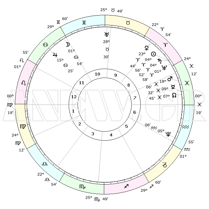 | | ΘΕΣΕΙΣ ΠΛΑΝΗΤΩΝ ΑΣΤΡΟΛΟΓΙΚΟΥ ΧΑΡΤΗ ΤΗΣ ΣΤΙΓΜΗΣ ΑΥΤΗΣ | | | | Πλανήτης | Ζώδιο | Μοίρες | Δεκαήμ. | Σε οίκο | Απόκλιση | | Ακμές των οίκων | | Ηλιος | Κριός | 04°48' | Πρώτο | 9 | 01 N 54 | | 1ος | 21°17' | Καρκίνος | | Σελήνη | Καρκίνος | 00°00' | Πρώτο | 12 | 28 N 18 | | 2ος | 11°52' | Λέων | | Ερμής | Ιχθείς | 09°29' | Πρώτο | 9 | 08 S 05 | | 3ος | 05°46' | Παρθένος | | Αφροδίτη | Κριός | 23°34' | Τρίτο | 10 | 08 N 30 | | 4ος | 05°34' | Ζυγός | | Αρης | Ιχθείς | 17°59' | Δεύτερο | 9 | 05 S 44 | | 5ος | 11°36' | Σκορπιός | | Δίας | Καρκίνος | 15°25' | Δεύτερο | 12 | 22 N 54 | | 6ος | 18°47' | Τοξότης | | Κρόνος | Κριός | 04°51' | Πρώτο | 9 | 00 S 02 | | 7ος | 21°17' | Αιγόκερως | | Ουρανός | Ταύρος | 28°29' | Τρίτο | 11 | 19 N 39 | | 8ος | 11°52' | Υδροχόος | | Ποσειδώνας | Κριός | 01°58' | Πρώτο | 9 | 00 S 25 | | 9ος | 05°46' | Ιχθείς | | Πλούτωνας | Υδροχόος | 05°06' | Πρώτο | 7 | 22 S 48 | | 10ος | 05°34' | Κριός | | Β. Δεσμός | Ιχθείς | 07°45' | Πρώτο | 9 | 08 S 40 | | 11ος | 11°36' | Ταύρος | | Ωροσκόπος | Καρκίνος | 21°17' | Τρίτο | | | 12ος | 18°47' | Δίδυμοι | | Μεσουράνημα | Κριός | 05°34' | Πρώτο | | | |