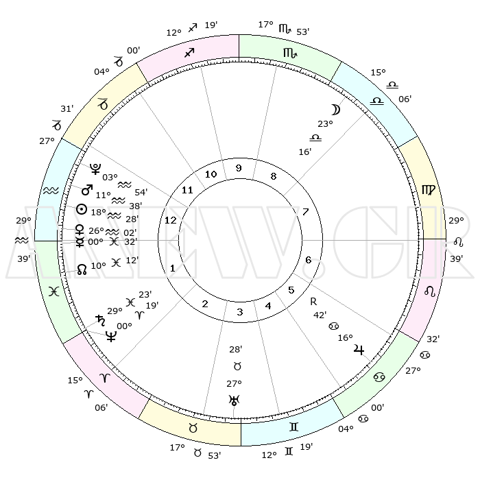 | | ΘΕΣΕΙΣ ΠΛΑΝΗΤΩΝ ΑΣΤΡΟΛΟΓΙΚΟΥ ΧΑΡΤΗ ΤΗΣ ΣΤΙΓΜΗΣ ΑΥΤΗΣ | | | | Πλανήτης | Ζώδιο | Μοίρες | Δεκαήμ. | Σε οίκο | Απόκλιση | | Ακμές των οίκων | | Ηλιος | Υδροχόος | 18°24' | Δεύτερο | 1 | 15 S 19 | | 1ος | 28°46' | Αιγόκερως | | Σελήνη | Ζυγός | 22°29' | Τρίτο | 9 | 12 S 06 | | 2ος | 12°39' | Ιχθείς | | Ερμής | Ιχθείς | 00°26' | Πρώτο | 1 | 12 S 33 | | 3ος | 21°17' | Κριός | | Αφροδίτη | Υδροχόος | 25°57' | Τρίτο | 1 | 14 S 13 | | 4ος | 19°58' | Ταύρος | | Αρης | Υδροχόος | 11°35' | Δεύτερο | 1 | 18 S 19 | | 5ος | 12°49' | Δίδυμοι | | Δίας | Καρκίνος | 16°42'R | Δεύτερο | 6 | 22 N 42 | | 6ος | 04°12' | Καρκίνος | | Κρόνος | Ιχθείς | 29°23' | Τρίτο | 2 | 02 S 14 | | 7ος | 28°46' | Καρκίνος | | Ουρανός | Ταύρος | 27°28' | Τρίτο | 4 | 19 N 24 | | 8ος | 12°39' | Παρθένος | | Ποσειδώνας | Κριός | 00°19' | Πρώτο | 2 | 01 S 05 | | 9ος | 21°17' | Ζυγός | | Πλούτωνας | Υδροχόος | 03°54' | Πρώτο | 1 | 22 S 59 | | 10ος | 19°58' | Σκορπιός | | Β. Δεσμός | Ιχθείς | 10°12' | Δεύτερο | 1 | 07 S 45 | | 11ος | 12°49' | Τοξότης | | Ωροσκόπος | Αιγόκερως | 28°46' | Τρίτο | | | 12ος | 04°12' | Αιγόκερως | | Μεσουράνημα | Σκορπιός | 19°58' | Δεύτερο | | | |