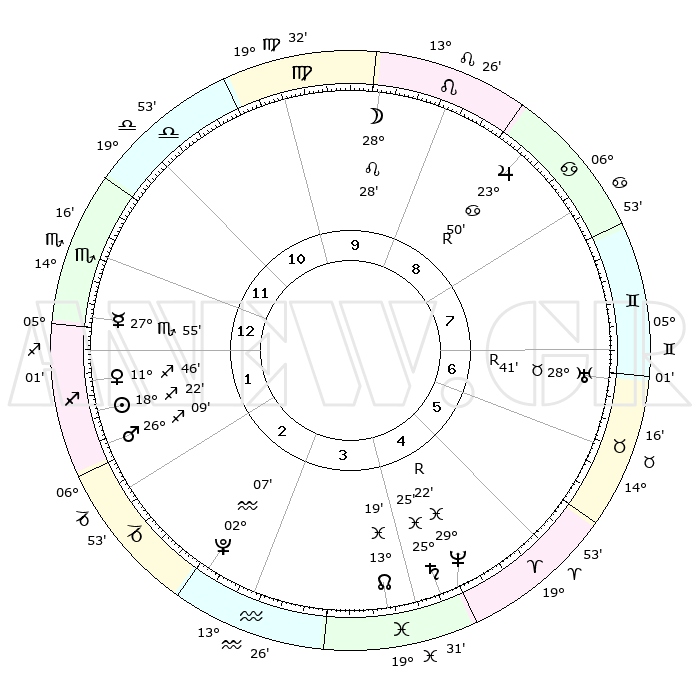 | | ΘΕΣΕΙΣ ΠΛΑΝΗΤΩΝ ΑΣΤΡΟΛΟΓΙΚΟΥ ΧΑΡΤΗ ΤΗΣ ΣΤΙΓΜΗΣ ΑΥΤΗΣ | | | | Πλανήτης | Ζώδιο | Μοίρες | Δεκαήμ. | Σε οίκο | Απόκλιση | | Ακμές των οίκων | | Ηλιος | Τοξότης | 18°20' | Δεύτερο | 1 | 22 S 55 | | 1ος | 24°51' | Σκορπιός | | Σελήνη | Λέων | 28°00' | Τρίτο | 9 | 13 N 24 | | 2ος | 25°19' | Τοξότης | | Ερμής | Σκορπιός | 27°53' | Τρίτο | 1 | 17 S 38 | | 3ος | 00°12' | Υδροχόος | | Αφροδίτη | Τοξότης | 11°43' | Δεύτερο | 1 | 21 S 50 | | 4ος | 06°04' | Ιχθείς | | Αρης | Τοξότης | 26°08' | Τρίτο | 2 | 24 S 07 | | 5ος | 07°41' | Κριός | | Δίας | Καρκίνος | 23°50'R | Τρίτο | 8 | 21 N 31 | | 6ος | 03°26' | Ταύρος | | Κρόνος | Ιχθείς | 25°25' | Τρίτο | 4 | 03 S 58 | | 7ος | 24°51' | Ταύρος | | Ουρανός | Ταύρος | 28°41'R | Τρίτο | 7 | 19 N 40 | | 8ος | 25°19' | Δίδυμοι | | Ποσειδώνας | Ιχθείς | 29°22'R | Τρίτο | 4 | 01 S 29 | | 9ος | 00°12' | Λέων | | Πλούτωνας | Υδροχόος | 02°07' | Πρώτο | 3 | 23 S 21 | | 10ος | 06°04' | Παρθένος | | Β. Δεσμός | Ιχθείς | 13°20' | Δεύτερο | 4 | 06 S 33 | | 11ος | 07°41' | Ζυγός | | Ωροσκόπος | Σκορπιός | 24°51' | Τρίτο | | | 12ος | 03°26' | Σκορπιός | | Μεσουράνημα | Παρθένος | 06°04' | Πρώτο | | | |