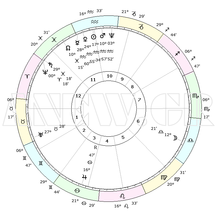 | | ΘΕΣΕΙΣ ΠΛΑΝΗΤΩΝ ΑΣΤΡΟΛΟΓΙΚΟΥ ΧΑΡΤΗ ΤΗΣ ΣΤΙΓΜΗΣ ΑΥΤΗΣ | | | | Πλανήτης | Ζώδιο | Μοίρες | Δεκαήμ. | Σε οίκο | Απόκλιση | | Ακμές των οίκων | | Ηλιος | Υδροχόος | 17°31' | Δεύτερο | 11 | 15 S 35 | | 1ος | 03°08' | Κριός | | Σελήνη | Ζυγός | 11°37' | Δεύτερο | 7 | 07 S 11 | | 2ος | 12°39' | Ταύρος | | Ερμής | Υδροχόος | 28°53' | Τρίτο | 12 | 13 S 11 | | 3ος | 09°35' | Δίδυμοι | | Αφροδίτη | Υδροχόος | 24°51' | Τρίτο | 12 | 14 S 35 | | 4ος | 01°45' | Καρκίνος | | Αρης | Υδροχόος | 10°54' | Δεύτερο | 11 | 18 S 31 | | 5ος | 24°12' | Καρκίνος | | Δίας | Καρκίνος | 16°48'R | Δεύτερο | 4 | 22 N 41 | | 6ος | 22°06' | Λέων | | Κρόνος | Ιχθείς | 29°18' | Τρίτο | 12 | 02 S 16 | | 7ος | 03°08' | Ζυγός | | Ουρανός | Ταύρος | 27°28' | Τρίτο | 2 | 19 N 24 | | 8ος | 12°39' | Σκορπιός | | Ποσειδώνας | Κριός | 00°18' | Πρώτο | 12 | 01 S 05 | | 9ος | 09°35' | Τοξότης | | Πλούτωνας | Υδροχόος | 03°52' | Πρώτο | 11 | 22 S 59 | | 10ος | 01°45' | Αιγόκερως | | Β. Δεσμός | Ιχθείς | 10°15' | Δεύτερο | 12 | 07 S 43 | | 11ος | 24°12' | Αιγόκερως | | Ωροσκόπος | Κριός | 03°08' | Πρώτο | | | 12ος | 22°06' | Υδροχόος | | Μεσουράνημα | Αιγόκερως | 01°45' | Πρώτο | | | |