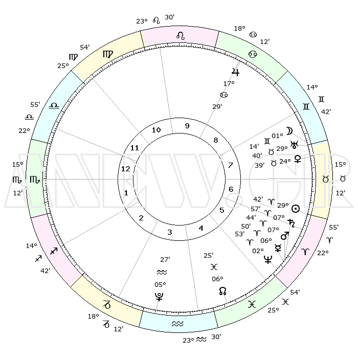 | | ΘΕΣΕΙΣ ΠΛΑΝΗΤΩΝ ΑΣΤΡΟΛΟΓΙΚΟΥ ΧΑΡΤΗ ΤΗΣ ΣΤΙΓΜΗΣ ΑΥΤΗΣ | | | | Πλανήτης | Ζώδιο | Μοίρες | Δεκαήμ. | Σε οίκο | Απόκλιση | | Ακμές των οίκων | | Ηλιος | Κριός | 29°39' | Τρίτο | 7 | 11 N 21 | | 1ος | 26°28' | Ζυγός | | Σελήνη | Δίδυμοι | 00°16' | Πρώτο | 8 | 25 N 09 | | 2ος | 24°40' | Σκορπιός | | Ερμής | Κριός | 06°44' | Πρώτο | 6 | 00 N 16 | | 3ος | 26°21' | Τοξότης | | Αφροδίτη | Ταύρος | 24°34' | Τρίτο | 7 | 19 N 17 | | 4ος | 00°19' | Υδροχόος | | Αρης | Κριός | 07°41' | Πρώτο | 6 | 02 N 10 | | 5ος | 03°16' | Ιχθείς | | Δίας | Καρκίνος | 17°29' | Δεύτερο | 9 | 22 N 40 | | 6ος | 02°14' | Κριός | | Κρόνος | Κριός | 07°57' | Πρώτο | 6 | 01 N 11 | | 7ος | 26°28' | Κριός | | Ουρανός | Ταύρος | 29°40' | Τρίτο | 8 | 19 N 55 | | 8ος | 24°40' | Ταύρος | | Ποσειδώνας | Κριός | 02°53' | Πρώτο | 6 | 00 S 03 | | 9ος | 26°21' | Δίδυμοι | | Πλούτωνας | Υδροχόος | 05°27' | Πρώτο | 4 | 22 S 48 | | 10ος | 00°19' | Λέων | | Β. Δεσμός | Ιχθείς | 06°25' | Πρώτο | 5 | 09 S 09 | | 11ος | 03°16' | Παρθένος | | Ωροσκόπος | Ζυγός | 26°28' | Τρίτο | | | 12ος | 02°14' | Ζυγός | | Μεσουράνημα | Λέων | 00°19' | Πρώτο | | | |