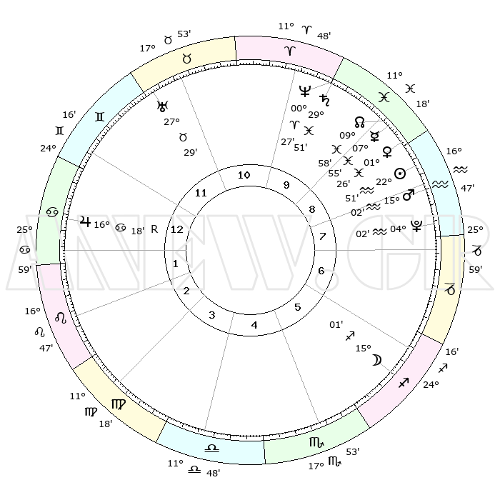 | | ΘΕΣΕΙΣ ΠΛΑΝΗΤΩΝ ΑΣΤΡΟΛΟΓΙΚΟΥ ΧΑΡΤΗ ΤΗΣ ΣΤΙΓΜΗΣ ΑΥΤΗΣ | | | | Πλανήτης | Ζώδιο | Μοίρες | Δεκαήμ. | Σε οίκο | Απόκλιση | | Ακμές των οίκων | | Ηλιος | Υδροχόος | 22°46' | Τρίτο | 9 | 13 S 55 | | 1ος | 05°39' | Καρκίνος | | Σελήνη | Τοξότης | 14°13' | Δεύτερο | 6 | 27 S 42 | | 2ος | 26°11' | Καρκίνος | | Ερμής | Ιχθείς | 07°49' | Πρώτο | 9 | 09 S 14 | | 3ος | 18°24' | Λέων | | Αφροδίτη | Ιχθείς | 01°21' | Πρώτο | 9 | 12 S 21 | | 4ος | 15°38' | Παρθένος | | Αρης | Υδροχόος | 14°59' | Δεύτερο | 8 | 17 S 22 | | 5ος | 20°24' | Ζυγός | | Δίας | Καρκίνος | 16°19'R | Δεύτερο | 1 | 22 N 45 | | 6ος | 29°53' | Σκορπιός | | Κρόνος | Ιχθείς | 29°51' | Τρίτο | 10 | 02 S 02 | | 7ος | 05°39' | Αιγόκερως | | Ουρανός | Ταύρος | 27°29' | Τρίτο | 11 | 19 N 25 | | 8ος | 26°11' | Αιγόκερως | | Ποσειδώνας | Κριός | 00°27' | Πρώτο | 10 | 01 S 01 | | 9ος | 18°24' | Υδροχόος | | Πλούτωνας | Υδροχόος | 04°02' | Πρώτο | 8 | 22 S 58 | | 10ος | 15°38' | Ιχθείς | | Β. Δεσμός | Ιχθείς | 09°58' | Πρώτο | 9 | 07 S 50 | | 11ος | 20°24' | Κριός | | Ωροσκόπος | Καρκίνος | 05°39' | Πρώτο | | | 12ος | 29°53' | Ταύρος | | Μεσουράνημα | Ιχθείς | 15°38' | Δεύτερο | | | |