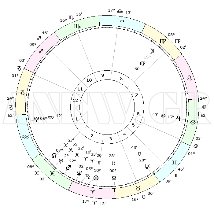 | | ΘΕΣΕΙΣ ΠΛΑΝΗΤΩΝ ΑΣΤΡΟΛΟΓΙΚΟΥ ΧΑΡΤΗ ΤΗΣ ΣΤΙΓΜΗΣ ΑΥΤΗΣ | | | | Πλανήτης | Ζώδιο | Μοίρες | Δεκαήμ. | Σε οίκο | Απόκλιση | | Ακμές των οίκων | | Ηλιος | Κριός | 10°12' | Δεύτερο | 4 | 04 N 02 | | 1ος | 12°47' | Τοξότης | | Σελήνη | Παρθένος | 14°24' | Δεύτερο | 9 | 05 N 40 | | 2ος | 16°01' | Αιγόκερως | | Ερμής | Ιχθείς | 12°49' | Δεύτερο | 3 | 07 S 47 | | 3ος | 23°52' | Υδροχόος | | Αφροδίτη | Ταύρος | 00°19' | Πρώτο | 5 | 11 N 07 | | 4ος | 29°44' | Ιχθείς | | Αρης | Ιχθείς | 22°16' | Τρίτο | 3 | 04 S 02 | | 5ος | 28°54' | Κριός | | Δίας | Καρκίνος | 15°43' | Δεύτερο | 7 | 22 N 53 | | 6ος | 22°19' | Ταύρος | | Κρόνος | Κριός | 05°32' | Πρώτο | 4 | 00 N 14 | | 7ος | 12°47' | Δίδυμοι | | Ουρανός | Ταύρος | 28°43' | Τρίτο | 6 | 19 N 42 | | 8ος | 16°01' | Καρκίνος | | Ποσειδώνας | Κριός | 02°10' | Πρώτο | 4 | 00 S 20 | | 9ος | 23°52' | Λέων | | Πλούτωνας | Υδροχόος | 05°12' | Πρώτο | 2 | 22 S 47 | | 10ος | 29°44' | Παρθένος | | Β. Δεσμός | Ιχθείς | 07°28' | Πρώτο | 3 | 08 S 46 | | 11ος | 28°54' | Ζυγός | | Ωροσκόπος | Τοξότης | 12°47' | Δεύτερο | | | 12ος | 22°19' | Σκορπιός | | Μεσουράνημα | Παρθένος | 29°44' | Τρίτο | | | |