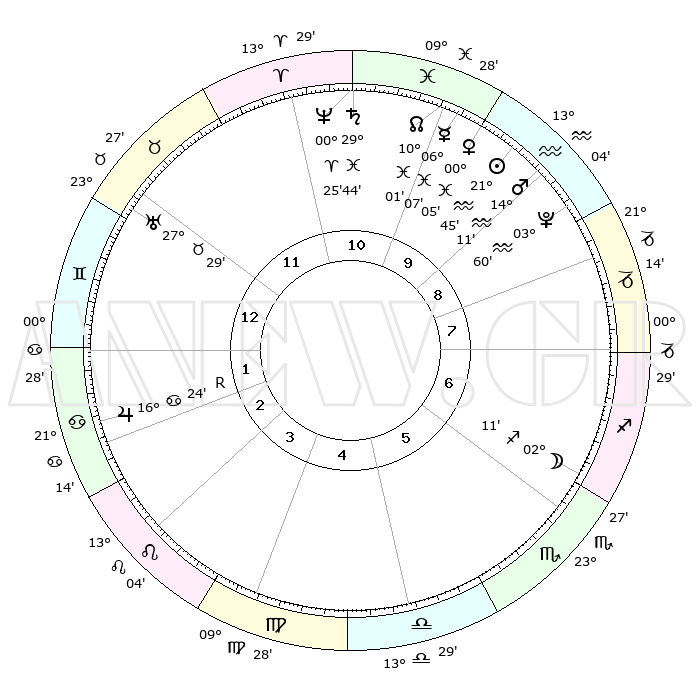 | | ΘΕΣΕΙΣ ΠΛΑΝΗΤΩΝ ΑΣΤΡΟΛΟΓΙΚΟΥ ΧΑΡΤΗ ΤΗΣ ΣΤΙΓΜΗΣ ΑΥΤΗΣ | | | | Πλανήτης | Ζώδιο | Μοίρες | Δεκαήμ. | Σε οίκο | Απόκλιση | | Ακμές των οίκων | | Ηλιος | Υδροχόος | 21°41' | Τρίτο | 10 | 14 S 16 | | 1ος | 07°28' | Δίδυμοι | | Σελήνη | Τοξότης | 01°26' | Πρώτο | 6 | 25 S 32 | | 2ος | 00°53' | Καρκίνος | | Ερμής | Ιχθείς | 06°01' | Πρώτο | 10 | 10 S 05 | | 3ος | 22°07' | Καρκίνος | | Αφροδίτη | Ιχθείς | 00°00' | Πρώτο | 10 | 12 S 50 | | 4ος | 15°30' | Λέων | | Αρης | Υδροχόος | 14°08' | Δεύτερο | 9 | 17 S 37 | | 5ος | 15°19' | Παρθένος | | Δίας | Καρκίνος | 16°24'R | Δεύτερο | 2 | 22 N 45 | | 6ος | 24°47' | Ζυγός | | Κρόνος | Ιχθείς | 29°44' | Τρίτο | 11 | 02 S 05 | | 7ος | 07°28' | Τοξότης | | Ουρανός | Ταύρος | 27°29' | Τρίτο | 12 | 19 N 25 | | 8ος | 00°53' | Αιγόκερως | | Ποσειδώνας | Κριός | 00°25' | Πρώτο | 11 | 01 S 02 | | 9ος | 22°07' | Αιγόκερως | | Πλούτωνας | Υδροχόος | 03°60' | Πρώτο | 9 | 22 S 58 | | 10ος | 15°30' | Υδροχόος | | Β. Δεσμός | Ιχθείς | 10°02' | Δεύτερο | 10 | 07 S 48 | | 11ος | 15°19' | Ιχθείς | | Ωροσκόπος | Δίδυμοι | 07°28' | Πρώτο | | | 12ος | 24°47' | Κριός | | Μεσουράνημα | Υδροχόος | 15°30' | Δεύτερο | | | |