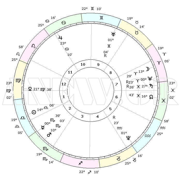| ΘΕΣΕΙΣ ΠΛΑΝΗΤΩΝ ΑΣΤΡΟΛΟΓΙΚΟΥ ΧΑΡΤΗ ΤΗΣ ΣΤΙΓΜΗΣ ΑΥΤΗΣ | | Πλανήτης | Ζώδιο | Μοίρες | Δεκαήμ. | Σε οίκο | Απόκλιση | | Ακμές των οίκων | Ηλιος | Ζυγός | 14°00' | Δεύτερο | 2 | 05 S 31 | | 1ος | 24°47' | Λέων | Σελήνη | Κριός | 12°03' | Δεύτερο | 8 | 06 N 43 | | 2ος | 18°05' | Παρθένος | Ερμής | Σκορπιός | 00°30' | Πρώτο | 3 | 12 S 25 | | 3ος | 16°15' | Ζυγός | Αφροδίτη | Παρθένος | 21°30' | Τρίτο | 2 | 04 N 40 | | 4ος | 19°05' | Σκορπιός | Αρης | Σκορπιός | 09°59' | Πρώτο | 3 | 14 S 57 | | 5ος | 23°38' | Τοξότης | Δίας | Καρκίνος | 23°09' | Τρίτο | 11 | 21 N 29 | | 6ος | 26°03' | Αιγόκερως | Κρόνος | Ιχθείς | 27°26'R | Τρίτο | 8 | 03 S 19 | | 7ος | 24°47' | Υδροχόος | Ουρανός | Δίδυμοι | 01°04'R | Πρώτο | 10 | 20 N 10 | | 8ος | 18°05' | Ιχθείς | Ποσειδώνας | Κριός | 00°23'R | Πρώτο | 8 | 01 S 07 | | 9ος | 16°15' | Κριός | Πλούτωνας | Υδροχόος | 01°23'R | Πρώτο | 6 | 23 S 32 | | 10ος | 19°05' | Ταύρος | Β. Δεσμός | Ιχθείς | 16°43' | Δεύτερο | 7 | 05 S 14 | | 11ος | 23°38' | Δίδυμοι | Ωροσκόπος | Λέων | 24°47' | Τρίτο | | | 12ος | 26°03' | Καρκίνος | Μεσουράνημα | Ταύρος | 19°05' | Δεύτερο | | | |