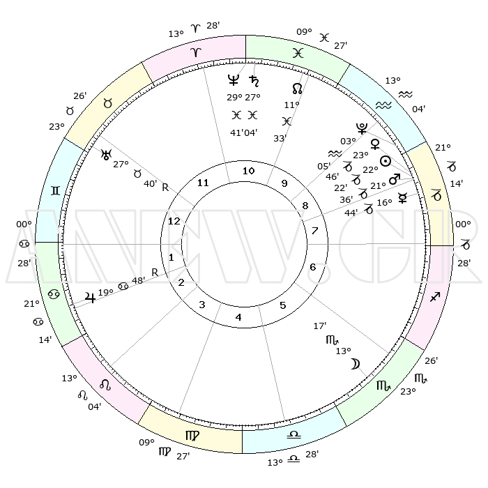 | | ΘΕΣΕΙΣ ΠΛΑΝΗΤΩΝ ΑΣΤΡΟΛΟΓΙΚΟΥ ΧΑΡΤΗ ΤΗΣ ΣΤΙΓΜΗΣ ΑΥΤΗΣ | | | | Πλανήτης | Ζώδιο | Μοίρες | Δεκαήμ. | Σε οίκο | Απόκλιση | | Ακμές των οίκων | | Ηλιος | Αιγόκερως | 22°14' | Τρίτο | 10 | 21 S 36 | | 1ος | 05°05' | Ταύρος | | Σελήνη | Σκορπιός | 11°41' | Δεύτερο | 7 | 19 S 37 | | 2ος | 05°55' | Δίδυμοι | | Ερμής | Αιγόκερως | 16°31' | Δεύτερο | 9 | 24 S 01 | | 3ος | 28°59' | Δίδυμοι | | Αφροδίτη | Αιγόκερως | 23°36' | Τρίτο | 10 | 22 S 15 | | 4ος | 20°43' | Καρκίνος | | Αρης | Αιγόκερως | 21°30' | Τρίτο | 10 | 22 S 40 | | 5ος | 15°39' | Λέων | | Δίας | Καρκίνος | 19°49'R | Δεύτερο | 3 | 22 N 14 | | 6ος | 19°22' | Παρθένος | | Κρόνος | Ιχθείς | 27°03' | Τρίτο | 12 | 03 S 13 | | 7ος | 05°05' | Σκορπιός | | Ουρανός | Ταύρος | 27°41'R | Τρίτο | 1 | 19 N 27 | | 8ος | 05°55' | Τοξότης | | Ποσειδώνας | Ιχθείς | 29°41' | Τρίτο | 12 | 01 S 20 | | 9ος | 28°59' | Τοξότης | | Πλούτωνας | Υδροχόος | 03°05' | Πρώτο | 10 | 23 S 09 | | 10ος | 20°43' | Αιγόκερως | | Β. Δεσμός | Ιχθείς | 11°34' | Δεύτερο | 11 | 07 S 14 | | 11ος | 15°39' | Υδροχόος | | Ωροσκόπος | Ταύρος | 05°05' | Πρώτο | | | 12ος | 19°22' | Ιχθείς | | Μεσουράνημα | Αιγόκερως | 20°43' | Τρίτο | | | |