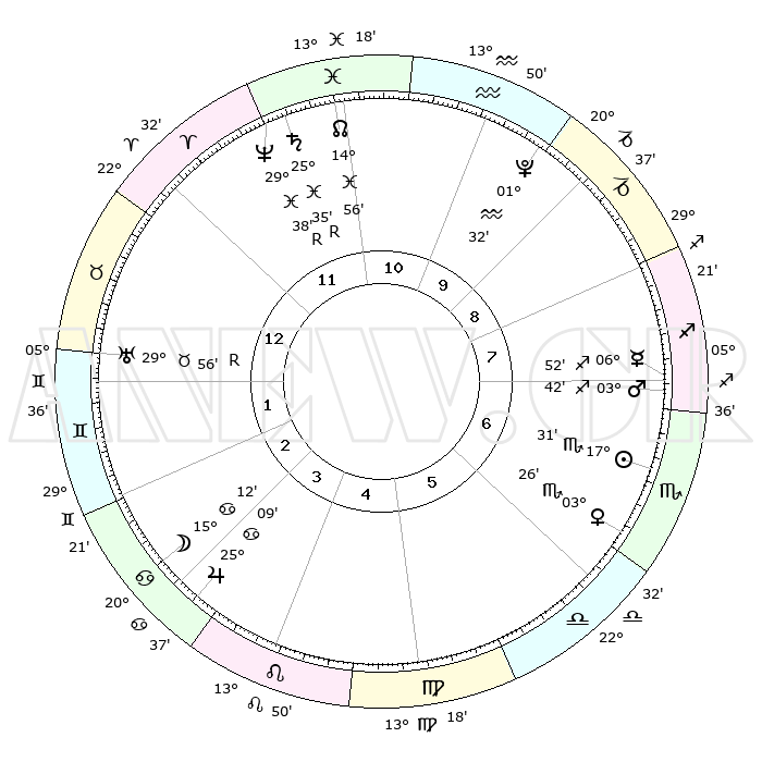 | | ΘΕΣΕΙΣ ΠΛΑΝΗΤΩΝ ΑΣΤΡΟΛΟΓΙΚΟΥ ΧΑΡΤΗ ΤΗΣ ΣΤΙΓΜΗΣ ΑΥΤΗΣ | | | | Πλανήτης | Ζώδιο | Μοίρες | Δεκαήμ. | Σε οίκο | Απόκλιση | | Ακμές των οίκων | | Ηλιος | Σκορπιός | 17°23' | Δεύτερο | 8 | 17 S 01 | | 1ος | 27°25' | Ιχθείς | | Σελήνη | Καρκίνος | 13°18' | Δεύτερο | 4 | 27 N 16 | | 2ος | 08°19' | Ταύρος | | Ερμής | Τοξότης | 06°51' | Πρώτο | 9 | 23 S 48 | | 3ος | 06°08' | Δίδυμοι | | Αφροδίτη | Σκορπιός | 03°16' | Πρώτο | 7 | 11 S 21 | | 4ος | 28°33' | Δίδυμοι | | Αρης | Τοξότης | 03°36' | Πρώτο | 8 | 21 S 20 | | 5ος | 20°45' | Καρκίνος | | Δίας | Καρκίνος | 25°09' | Τρίτο | 5 | 21 N 12 | | 6ος | 17°45' | Λέων | | Κρόνος | Ιχθείς | 25°35'R | Τρίτο | 12 | 04 S 00 | | 7ος | 27°25' | Παρθένος | | Ουρανός | Ταύρος | 29°56'R | Τρίτο | 2 | 19 N 56 | | 8ος | 08°19' | Σκορπιός | | Ποσειδώνας | Ιχθείς | 29°38'R | Τρίτο | 1 | 01 S 24 | | 9ος | 06°08' | Τοξότης | | Πλούτωνας | Υδροχόος | 01°32' | Πρώτο | 11 | 23 S 29 | | 10ος | 28°33' | Τοξότης | | Β. Δεσμός | Ιχθείς | 14°57' | Δεύτερο | 12 | 05 S 56 | | 11ος | 20°45' | Αιγόκερως | | Ωροσκόπος | Ιχθείς | 27°25' | Τρίτο | | | 12ος | 17°45' | Υδροχόος | | Μεσουράνημα | Τοξότης | 28°33' | Τρίτο | | | |