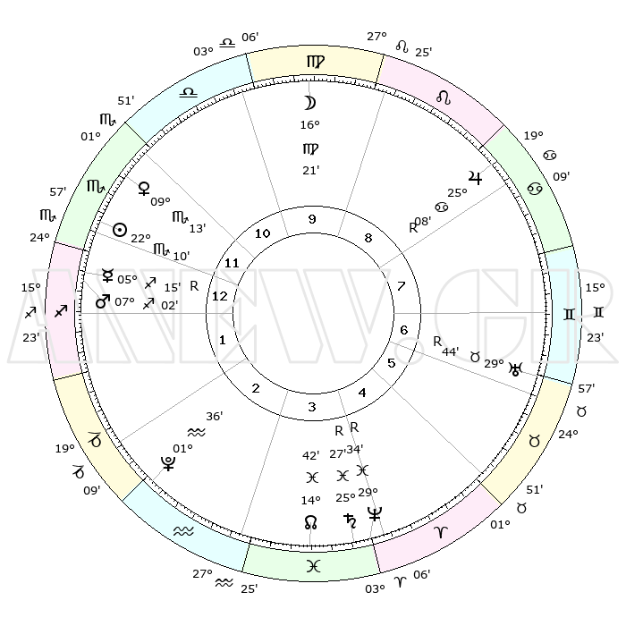 | | ΘΕΣΕΙΣ ΠΛΑΝΗΤΩΝ ΑΣΤΡΟΛΟΓΙΚΟΥ ΧΑΡΤΗ ΤΗΣ ΣΤΙΓΜΗΣ ΑΥΤΗΣ | | | | Πλανήτης | Ζώδιο | Μοίρες | Δεκαήμ. | Σε οίκο | Απόκλιση | | Ακμές των οίκων | | Ηλιος | Σκορπιός | 22°05' | Τρίτο | 12 | 18 S 17 | | 1ος | 23°23' | Σκορπιός | | Σελήνη | Παρθένος | 15°26' | Δεύτερο | 10 | 05 N 48 | | 2ος | 23°42' | Τοξότης | | Ερμής | Τοξότης | 05°18'R | Πρώτο | 1 | 22 S 36 | | 3ος | 28°21' | Αιγόκερως | | Αφροδίτη | Σκορπιός | 09°08' | Πρώτο | 12 | 13 S 22 | | 4ος | 04°09' | Ιχθείς | | Αρης | Τοξότης | 06°59' | Πρώτο | 1 | 21 S 59 | | 5ος | 05°54' | Κριός | | Δίας | Καρκίνος | 25°08'R | Τρίτο | 8 | 21 N 13 | | 6ος | 01°51' | Ταύρος | | Κρόνος | Ιχθείς | 25°27'R | Τρίτο | 4 | 04 S 02 | | 7ος | 23°23' | Ταύρος | | Ουρανός | Ταύρος | 29°45'R | Τρίτο | 7 | 19 N 53 | | 8ος | 23°42' | Δίδυμοι | | Ποσειδώνας | Ιχθείς | 29°34'R | Τρίτο | 4 | 01 S 25 | | 9ος | 28°21' | Καρκίνος | | Πλούτωνας | Υδροχόος | 01°36' | Πρώτο | 3 | 23 S 28 | | 10ος | 04°09' | Παρθένος | | Β. Δεσμός | Ιχθείς | 14°42' | Δεύτερο | 4 | 06 S 01 | | 11ος | 05°54' | Ζυγός | | Ωροσκόπος | Σκορπιός | 23°23' | Τρίτο | | | 12ος | 01°51' | Σκορπιός | | Μεσουράνημα | Παρθένος | 04°09' | Πρώτο | | | |