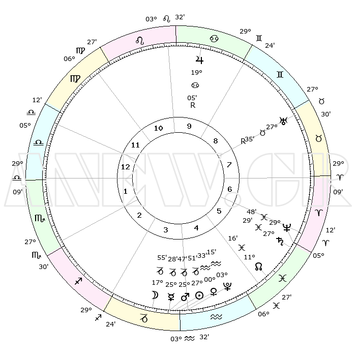 | | ΘΕΣΕΙΣ ΠΛΑΝΗΤΩΝ ΑΣΤΡΟΛΟΓΙΚΟΥ ΧΑΡΤΗ ΤΗΣ ΣΤΙΓΜΗΣ ΑΥΤΗΣ | | | | Πλανήτης | Ζώδιο | Μοίρες | Δεκαήμ. | Σε οίκο | Απόκλιση | | Ακμές των οίκων | | Ηλιος | Αιγόκερως | 27°46' | Τρίτο | 4 | 20 S 36 | | 1ος | 03°28' | Ζυγός | | Σελήνη | Αιγόκερως | 16°50' | Δεύτερο | 4 | 26 S 26 | | 2ος | 00°18' | Σκορπιός | | Ερμής | Αιγόκερως | 25°20' | Τρίτο | 4 | 22 S 58 | | 3ος | 00°52' | Τοξότης | | Αφροδίτη | Υδροχόος | 00°26' | Πρώτο | 4 | 21 S 05 | | 4ος | 03°54' | Αιγόκερως | | Αρης | Αιγόκερως | 25°43' | Τρίτο | 4 | 21 S 58 | | 5ος | 06°51' | Υδροχόος | | Δίας | Καρκίνος | 19°06'R | Δεύτερο | 10 | 22 N 21 | | 6ος | 07°09' | Ιχθείς | | Κρόνος | Ιχθείς | 27°29' | Τρίτο | 6 | 03 S 02 | | 7ος | 03°28' | Κριός | | Ουρανός | Ταύρος | 27°35'R | Τρίτο | 8 | 19 N 26 | | 8ος | 00°18' | Ταύρος | | Ποσειδώνας | Ιχθείς | 29°48' | Τρίτο | 6 | 01 S 18 | | 9ος | 00°52' | Δίδυμοι | | Πλούτωνας | Υδροχόος | 03°15' | Πρώτο | 4 | 23 S 07 | | 10ος | 03°54' | Καρκίνος | | Β. Δεσμός | Ιχθείς | 11°17' | Δεύτερο | 6 | 07 S 20 | | 11ος | 06°51' | Λέων | | Ωροσκόπος | Ζυγός | 03°28' | Πρώτο | | | 12ος | 07°09' | Παρθένος | | Μεσουράνημα | Καρκίνος | 03°54' | Πρώτο | | | |