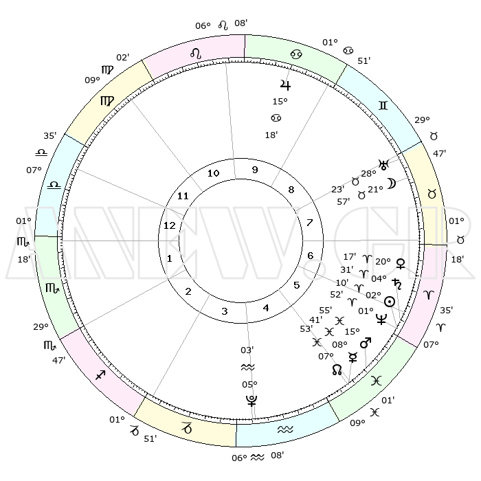 | | ΘΕΣΕΙΣ ΠΛΑΝΗΤΩΝ ΑΣΤΡΟΛΟΓΙΚΟΥ ΧΑΡΤΗ ΤΗΣ ΣΤΙΓΜΗΣ ΑΥΤΗΣ | | | | Πλανήτης | Ζώδιο | Μοίρες | Δεκαήμ. | Σε οίκο | Απόκλιση | | Ακμές των οίκων | | Ηλιος | Κριός | 02°05' | Πρώτο | 6 | 00 N 50 | | 1ος | 08°19' | Ζυγός | | Σελήνη | Ταύρος | 20°48' | Τρίτο | 8 | 22 N 45 | | 2ος | 05°28' | Σκορπιός | | Ερμής | Ιχθείς | 08°40' | Πρώτο | 5 | 07 S 50 | | 3ος | 06°13' | Τοξότης | | Αφροδίτη | Κριός | 20°11' | Τρίτο | 7 | 07 N 09 | | 4ος | 09°21' | Αιγόκερως | | Αρης | Ιχθείς | 15°51' | Δεύτερο | 6 | 06 S 34 | | 5ος | 12°17' | Υδροχόος | | Δίας | Καρκίνος | 15°18' | Δεύτερο | 10 | 22 N 55 | | 6ος | 12°22' | Ιχθείς | | Κρόνος | Κριός | 04°30' | Πρώτο | 6 | 00 S 10 | | 7ος | 08°19' | Κριός | | Ουρανός | Ταύρος | 28°23' | Τρίτο | 8 | 19 N 38 | | 8ος | 05°28' | Ταύρος | | Ποσειδώνας | Κριός | 01°52' | Πρώτο | 6 | 00 S 28 | | 9ος | 06°13' | Δίδυμοι | | Πλούτωνας | Υδροχόος | 05°03' | Πρώτο | 4 | 22 S 48 | | 10ος | 09°21' | Καρκίνος | | Β. Δεσμός | Ιχθείς | 07°54' | Πρώτο | 5 | 08 S 36 | | 11ος | 12°17' | Λέων | | Ωροσκόπος | Ζυγός | 08°19' | Πρώτο | | | 12ος | 12°22' | Παρθένος | | Μεσουράνημα | Καρκίνος | 09°21' | Πρώτο | | | |