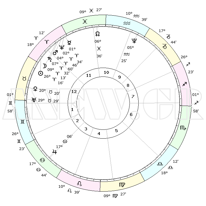 | | ΘΕΣΕΙΣ ΠΛΑΝΗΤΩΝ ΑΣΤΡΟΛΟΓΙΚΟΥ ΧΑΡΤΗ ΤΗΣ ΣΤΙΓΜΗΣ ΑΥΤΗΣ | | | | Πλανήτης | Ζώδιο | Μοίρες | Δεκαήμ. | Σε οίκο | Απόκλιση | | Ακμές των οίκων | | Ηλιος | Κριός | 26°12' | Τρίτο | 12 | 10 N 07 | | 1ος | 29°24' | Κριός | | Σελήνη | Κριός | 08°14' | Πρώτο | 12 | 05 N 38 | | 2ος | 01°47' | Δίδυμοι | | Ερμής | Κριός | 01°28' | Πρώτο | 12 | 01 S 49 | | 3ος | 25°25' | Δίδυμοι | | Αφροδίτη | Ταύρος | 20°15' | Τρίτο | 1 | 18 N 01 | | 4ος | 17°06' | Καρκίνος | | Αρης | Κριός | 04°57' | Πρώτο | 12 | 01 N 04 | | 5ος | 11°26' | Λέων | | Δίας | Καρκίνος | 17°05' | Δεύτερο | 3 | 22 N 43 | | 6ος | 14°02' | Παρθένος | | Κρόνος | Κριός | 07°32' | Πρώτο | 12 | 01 N 01 | | 7ος | 29°24' | Ζυγός | | Ουρανός | Ταύρος | 29°29' | Τρίτο | 1 | 19 N 52 | | 8ος | 01°47' | Τοξότης | | Ποσειδώνας | Κριός | 02°46' | Πρώτο | 12 | 00 S 06 | | 9ος | 25°25' | Τοξότης | | Πλούτωνας | Υδροχόος | 05°25' | Πρώτο | 10 | 22 S 47 | | 10ος | 17°06' | Αιγόκερως | | Β. Δεσμός | Ιχθείς | 06°36' | Πρώτο | 11 | 09 S 05 | | 11ος | 11°26' | Υδροχόος | | Ωροσκόπος | Κριός | 29°24' | Τρίτο | | | 12ος | 14°02' | Ιχθείς | | Μεσουράνημα | Αιγόκερως | 17°06' | Δεύτερο | | | |