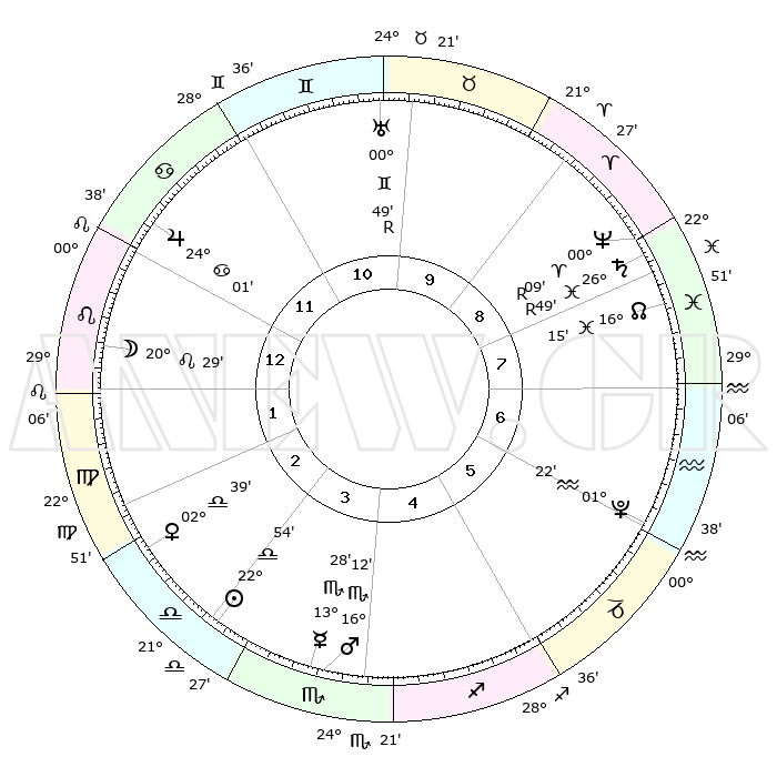 | ΘΕΣΕΙΣ ΠΛΑΝΗΤΩΝ ΑΣΤΡΟΛΟΓΙΚΟΥ ΧΑΡΤΗ ΤΗΣ ΣΤΙΓΜΗΣ ΑΥΤΗΣ | | Πλανήτης | Ζώδιο | Μοίρες | Δεκαήμ. | Σε οίκο | Απόκλιση | | Ακμές των οίκων | Ηλιος | Ζυγός | 22°47' | Τρίτο | 4 | 08 S 52 | | 1ος | 28°03' | Καρκίνος | Σελήνη | Λέων | 19°07' | Δεύτερο | 2 | 17 N 29 | | 2ος | 18°58' | Λέων | Ερμής | Σκορπιός | 13°19' | Δεύτερο | 4 | 17 S 34 | | 3ος | 13°45' | Παρθένος | Αφροδίτη | Ζυγός | 02°31' | Πρώτο | 3 | 00 N 24 | | 4ος | 14°32' | Ζυγός | Αρης | Σκορπιός | 16°08' | Δεύτερο | 4 | 16 S 53 | | 5ος | 20°37' | Σκορπιός | Δίας | Καρκίνος | 24°00' | Τρίτο | 12 | 21 N 21 | | 6ος | 26°39' | Τοξότης | Κρόνος | Ιχθείς | 26°50'R | Τρίτο | 9 | 03 S 33 | | 7ος | 28°03' | Αιγόκερως | Ουρανός | Δίδυμοι | 00°50'R | Πρώτο | 11 | 20 N 07 | | 8ος | 18°58' | Υδροχόος | Ποσειδώνας | Κριός | 00°09'R | Πρώτο | 9 | 01 S 12 | | 9ος | 13°45' | Ιχθείς | Πλούτωνας | Υδροχόος | 01°22' | Πρώτο | 7 | 23 S 32 | | 10ος | 14°32' | Κριός | Β. Δεσμός | Ιχθείς | 16°15' | Δεύτερο | 9 | 05 S 25 | | 11ος | 20°37' | Ταύρος | Ωροσκόπος | Καρκίνος | 28°03' | Τρίτο | | | 12ος | 26°39' | Δίδυμοι | Μεσουράνημα | Κριός | 14°32' | Δεύτερο | | | |
