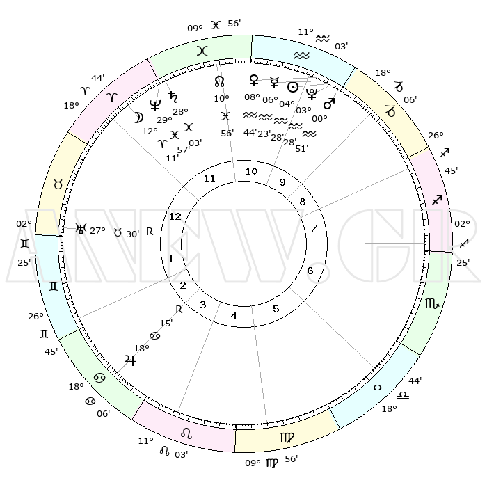 | | ΘΕΣΕΙΣ ΠΛΑΝΗΤΩΝ ΑΣΤΡΟΛΟΓΙΚΟΥ ΧΑΡΤΗ ΤΗΣ ΣΤΙΓΜΗΣ ΑΥΤΗΣ | | | | Πλανήτης | Ζώδιο | Μοίρες | Δεκαήμ. | Σε οίκο | Απόκλιση | | Ακμές των οίκων | | Ηλιος | Υδροχόος | 04°24' | Πρώτο | 10 | 19 S 09 | | 1ος | 28°07' | Κριός | | Σελήνη | Κριός | 11°13' | Δεύτερο | 12 | 06 N 58 | | 2ος | 00°52' | Δίδυμοι | | Ερμής | Υδροχόος | 06°15' | Πρώτο | 10 | 20 S 44 | | 3ος | 24°37' | Δίδυμοι | | Αφροδίτη | Υδροχόος | 08°38' | Πρώτο | 10 | 19 S 17 | | 4ος | 16°18' | Καρκίνος | | Αρης | Υδροχόος | 00°48' | Πρώτο | 10 | 20 S 58 | | 5ος | 10°31' | Λέων | | Δίας | Καρκίνος | 18°15'R | Δεύτερο | 4 | 22 N 29 | | 6ος | 12°52' | Παρθένος | | Κρόνος | Ιχθείς | 28°02' | Τρίτο | 12 | 02 S 47 | | 7ος | 28°07' | Ζυγός | | Ουρανός | Ταύρος | 27°30'R | Τρίτο | 1 | 19 N 25 | | 8ος | 00°52' | Τοξότης | | Ποσειδώνας | Ιχθείς | 29°57' | Τρίτο | 12 | 01 S 14 | | 9ος | 24°37' | Τοξότης | | Πλούτωνας | Υδροχόος | 03°27' | Πρώτο | 10 | 23 S 04 | | 10ος | 16°18' | Αιγόκερως | | Β. Δεσμός | Ιχθείς | 10°56' | Δεύτερο | 11 | 07 S 28 | | 11ος | 10°31' | Υδροχόος | | Ωροσκόπος | Κριός | 28°07' | Τρίτο | | | 12ος | 12°52' | Ιχθείς | | Μεσουράνημα | Αιγόκερως | 16°18' | Δεύτερο | | | |