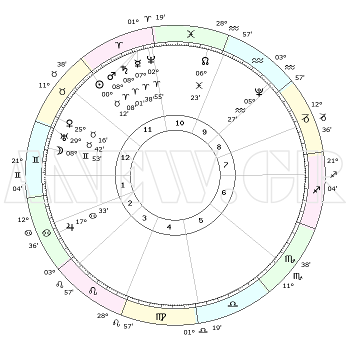 | | ΘΕΣΕΙΣ ΠΛΑΝΗΤΩΝ ΑΣΤΡΟΛΟΓΙΚΟΥ ΧΑΡΤΗ ΤΗΣ ΣΤΙΓΜΗΣ ΑΥΤΗΣ | | | | Πλανήτης | Ζώδιο | Μοίρες | Δεκαήμ. | Σε οίκο | Απόκλιση | | Ακμές των οίκων | | Ηλιος | Ταύρος | 00°09' | Πρώτο | 12 | 11 N 31 | | 1ος | 29°14' | Ταύρος | | Σελήνη | Δίδυμοι | 08°02' | Πρώτο | 1 | 26 N 40 | | 2ος | 24°12' | Δίδυμοι | | Ερμής | Κριός | 07°32' | Πρώτο | 11 | 00 N 35 | | 3ος | 15°39' | Καρκίνος | | Αφροδίτη | Ταύρος | 25°12' | Τρίτο | 12 | 19 N 28 | | 4ος | 08°21' | Λέων | | Αρης | Κριός | 08°05' | Πρώτο | 11 | 02 N 20 | | 5ος | 06°41' | Παρθένος | | Δίας | Καρκίνος | 17°32' | Δεύτερο | 3 | 22 N 40 | | 6ος | 15°01' | Ζυγός | | Κρόνος | Κριός | 08°01' | Πρώτο | 11 | 01 N 12 | | 7ος | 29°14' | Σκορπιός | | Ουρανός | Ταύρος | 29°42' | Τρίτο | 1 | 19 N 55 | | 8ος | 24°12' | Τοξότης | | Ποσειδώνας | Κριός | 02°54' | Πρώτο | 11 | 00 S 03 | | 9ος | 15°39' | Αιγόκερως | | Πλούτωνας | Υδροχόος | 05°27' | Πρώτο | 9 | 22 S 48 | | 10ος | 08°21' | Υδροχόος | | Β. Δεσμός | Ιχθείς | 06°23' | Πρώτο | 10 | 09 S 10 | | 11ος | 06°41' | Ιχθείς | | Ωροσκόπος | Ταύρος | 29°14' | Τρίτο | | | 12ος | 15°01' | Κριός | | Μεσουράνημα | Υδροχόος | 08°21' | Πρώτο | | | |