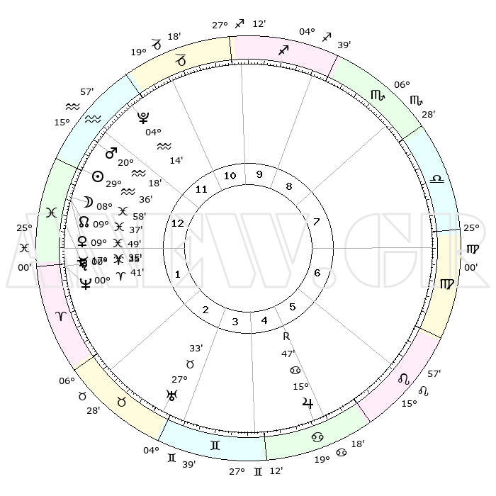 | | ΘΕΣΕΙΣ ΠΛΑΝΗΤΩΝ ΑΣΤΡΟΛΟΓΙΚΟΥ ΧΑΡΤΗ ΤΗΣ ΣΤΙΓΜΗΣ ΑΥΤΗΣ | | | | Πλανήτης | Ζώδιο | Μοίρες | Δεκαήμ. | Σε οίκο | Απόκλιση | | Ακμές των οίκων | | Ηλιος | Υδροχόος | 29°32' | Τρίτο | 1 | 11 S 38 | | 1ος | 17°33' | Υδροχόος | | Σελήνη | Ιχθείς | 08°03' | Πρώτο | 1 | 08 S 38 | | 2ος | 03°20' | Κριός | | Ερμής | Ιχθείς | 17°30' | Δεύτερο | 1 | 04 S 12 | | 3ος | 08°32' | Ταύρος | | Αφροδίτη | Ιχθείς | 09°44' | Πρώτο | 1 | 09 S 16 | | 4ος | 04°21' | Δίδυμοι | | Αρης | Υδροχόος | 20°14' | Τρίτο | 1 | 15 S 46 | | 5ος | 26°14' | Δίδυμοι | | Δίας | Καρκίνος | 15°48'R | Δεύτερο | 5 | 22 N 50 | | 6ος | 18°40' | Καρκίνος | | Κρόνος | Κριός | 00°35' | Πρώτο | 1 | 01 S 44 | | 7ος | 17°33' | Λέων | | Ουρανός | Ταύρος | 27°33' | Τρίτο | 3 | 19 N 26 | | 8ος | 03°20' | Ζυγός | | Ποσειδώνας | Κριός | 00°40' | Πρώτο | 1 | 00 S 56 | | 9ος | 08°32' | Σκορπιός | | Πλούτωνας | Υδροχόος | 04°14' | Πρώτο | 12 | 22 S 56 | | 10ος | 04°21' | Τοξότης | | Β. Δεσμός | Ιχθείς | 09°37' | Πρώτο | 1 | 07 S 58 | | 11ος | 26°14' | Τοξότης | | Ωροσκόπος | Υδροχόος | 17°33' | Δεύτερο | | | 12ος | 18°40' | Αιγόκερως | | Μεσουράνημα | Τοξότης | 04°21' | Πρώτο | | | |
