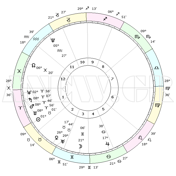 | | ΘΕΣΕΙΣ ΠΛΑΝΗΤΩΝ ΑΣΤΡΟΛΟΓΙΚΟΥ ΧΑΡΤΗ ΤΗΣ ΣΤΙΓΜΗΣ ΑΥΤΗΣ | | | | Πλανήτης | Ζώδιο | Μοίρες | Δεκαήμ. | Σε οίκο | Απόκλιση | | Ακμές των οίκων | | Ηλιος | Ταύρος | 00°57' | Πρώτο | 2 | 11 N 48 | | 1ος | 21°18' | Υδροχόος | | Σελήνη | Δίδυμοι | 20°07' | Τρίτο | 4 | 28 N 02 | | 2ος | 07°06' | Κριός | | Ερμής | Κριός | 08°49' | Πρώτο | 2 | 01 N 06 | | 3ος | 11°34' | Ταύρος | | Αφροδίτη | Ταύρος | 26°12' | Τρίτο | 3 | 19 N 44 | | 4ος | 06°55' | Δίδυμοι | | Αρης | Κριός | 08°43' | Πρώτο | 2 | 02 N 35 | | 5ος | 28°42' | Δίδυμοι | | Δίας | Καρκίνος | 17°38' | Δεύτερο | 5 | 22 N 39 | | 6ος | 21°26' | Καρκίνος | | Κρόνος | Κριός | 08°06' | Πρώτο | 2 | 01 N 14 | | 7ος | 21°18' | Λέων | | Ουρανός | Ταύρος | 29°44' | Τρίτο | 3 | 19 N 56 | | 8ος | 07°06' | Ζυγός | | Ποσειδώνας | Κριός | 02°56' | Πρώτο | 1 | 00 S 02 | | 9ος | 11°34' | Σκορπιός | | Πλούτωνας | Υδροχόος | 05°27' | Πρώτο | 12 | 22 S 48 | | 10ος | 06°55' | Τοξότης | | Β. Δεσμός | Ιχθείς | 06°21' | Πρώτο | 1 | 09 S 11 | | 11ος | 28°42' | Τοξότης | | Ωροσκόπος | Υδροχόος | 21°18' | Τρίτο | | | 12ος | 21°26' | Αιγόκερως | | Μεσουράνημα | Τοξότης | 06°55' | Πρώτο | | | |