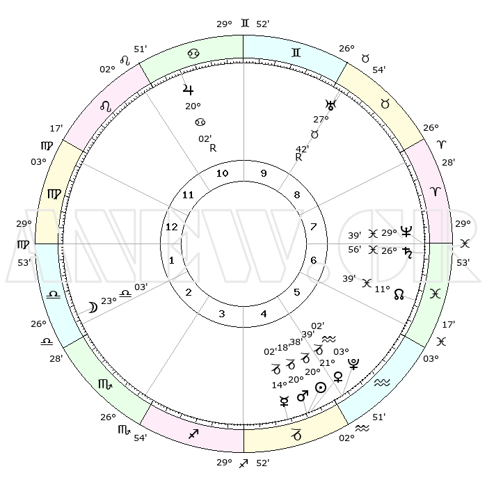 | | ΘΕΣΕΙΣ ΠΛΑΝΗΤΩΝ ΑΣΤΡΟΛΟΓΙΚΟΥ ΧΑΡΤΗ ΤΗΣ ΣΤΙΓΜΗΣ ΑΥΤΗΣ | | | | Πλανήτης | Ζώδιο | Μοίρες | Δεκαήμ. | Σε οίκο | Απόκλιση | | Ακμές των οίκων | | Ηλιος | Αιγόκερως | 19°55' | Δεύτερο | 1 | 21 S 57 | | 1ος | 24°31' | Τοξότης | | Σελήνη | Ζυγός | 14°26' | Δεύτερο | 9 | 08 S 20 | | 2ος | 00°19' | Υδροχόος | | Ερμής | Αιγόκερως | 12°54' | Δεύτερο | 1 | 24 S 15 | | 3ος | 09°49' | Ιχθείς | | Αφροδίτη | Αιγόκερως | 20°45' | Τρίτο | 1 | 22 S 39 | | 4ος | 14°34' | Κριός | | Αρης | Αιγόκερως | 19°45' | Δεύτερο | 1 | 22 S 55 | | 5ος | 11°46' | Ταύρος | | Δίας | Καρκίνος | 20°08'R | Τρίτο | 7 | 22 N 11 | | 6ος | 03°59' | Δίδυμοι | | Κρόνος | Ιχθείς | 26°53' | Τρίτο | 3 | 03 S 17 | | 7ος | 24°31' | Δίδυμοι | | Ουρανός | Ταύρος | 27°43'R | Τρίτο | 5 | 19 N 27 | | 8ος | 00°19' | Λέων | | Ποσειδώνας | Ιχθείς | 29°39' | Τρίτο | 3 | 01 S 21 | | 9ος | 09°49' | Παρθένος | | Πλούτωνας | Υδροχόος | 03°00' | Πρώτο | 2 | 23 S 10 | | 10ος | 14°34' | Ζυγός | | Β. Δεσμός | Ιχθείς | 11°41' | Δεύτερο | 3 | 07 S 11 | | 11ος | 11°46' | Σκορπιός | | Ωροσκόπος | Τοξότης | 24°31' | Τρίτο | | | 12ος | 03°59' | Τοξότης | | Μεσουράνημα | Ζυγός | 14°34' | Δεύτερο | | | |