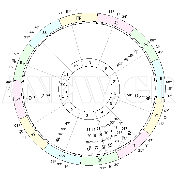 | | ΘΕΣΕΙΣ ΠΛΑΝΗΤΩΝ ΑΣΤΡΟΛΟΓΙΚΟΥ ΧΑΡΤΗ ΤΗΣ ΣΤΙΓΜΗΣ ΑΥΤΗΣ | | | | Πλανήτης | Ζώδιο | Μοίρες | Δεκαήμ. | Σε οίκο | Απόκλιση | | Ακμές των οίκων | | Ηλιος | Ιχθείς | 20°19' | Τρίτο | 4 | 03 S 50 | | 1ος | 22°47' | Σκορπιός | | Σελήνη | Τοξότης | 14°50' | Δεύτερο | 1 | 27 S 47 | | 2ος | 23°02' | Τοξότης | | Ερμής | Ιχθείς | 13°28'R | Δεύτερο | 4 | 03 S 30 | | 3ος | 27°35' | Αιγόκερως | | Αφροδίτη | Κριός | 05°32' | Πρώτο | 5 | 01 N 08 | | 4ος | 03°21' | Ιχθείς | | Αρης | Ιχθείς | 06°33' | Πρώτο | 4 | 10 S 07 | | 5ος | 05°11' | Κριός | | Δίας | Καρκίνος | 15°05'R | Δεύτερο | 8 | 22 N 56 | | 6ος | 01°12' | Ταύρος | | Κρόνος | Κριός | 03°02' | Πρώτο | 4 | 00 S 45 | | 7ος | 22°47' | Ταύρος | | Ουρανός | Ταύρος | 27°59' | Τρίτο | 7 | 19 N 32 | | 8ος | 23°02' | Δίδυμοι | | Ποσειδώνας | Κριός | 01°25' | Πρώτο | 4 | 00 S 38 | | 9ος | 27°35' | Καρκίνος | | Πλούτωνας | Υδροχόος | 04°47' | Πρώτο | 3 | 22 S 50 | | 10ος | 03°21' | Παρθένος | | Β. Δεσμός | Ιχθείς | 08°31' | Πρώτο | 4 | 08 S 22 | | 11ος | 05°11' | Ζυγός | | Ωροσκόπος | Σκορπιός | 22°47' | Τρίτο | | | 12ος | 01°12' | Σκορπιός | | Μεσουράνημα | Παρθένος | 03°21' | Πρώτο | | | |