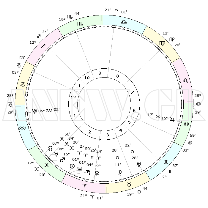 | | ΘΕΣΕΙΣ ΠΛΑΝΗΤΩΝ ΑΣΤΡΟΛΟΓΙΚΟΥ ΧΑΡΤΗ ΤΗΣ ΣΤΙΓΜΗΣ ΑΥΤΗΣ | | | | Πλανήτης | Ζώδιο | Μοίρες | Δεκαήμ. | Σε οίκο | Απόκλιση | | Ακμές των οίκων | | Ηλιος | Κριός | 01°23' | Πρώτο | 3 | 00 N 33 | | 1ος | 03°28' | Αιγόκερως | | Σελήνη | Ταύρος | 10°30' | Δεύτερο | 4 | 19 N 20 | | 2ος | 11°30' | Υδροχόος | | Ερμής | Ιχθείς | 08°34' | Πρώτο | 2 | 07 S 42 | | 3ος | 21°42' | Ιχθείς | | Αφροδίτη | Κριός | 19°19' | Δεύτερο | 3 | 06 N 48 | | 4ος | 25°04' | Κριός | | Αρης | Ιχθείς | 15°17' | Δεύτερο | 2 | 06 S 47 | | 5ος | 20°51' | Ταύρος | | Δίας | Καρκίνος | 15°17' | Δεύτερο | 7 | 22 N 55 | | 6ος | 12°26' | Δίδυμοι | | Κρόνος | Κριός | 04°25' | Πρώτο | 3 | 00 S 12 | | 7ος | 03°28' | Καρκίνος | | Ουρανός | Ταύρος | 28°21' | Τρίτο | 5 | 19 N 37 | | 8ος | 11°30' | Λέων | | Ποσειδώνας | Κριός | 01°50' | Πρώτο | 3 | 00 S 28 | | 9ος | 21°42' | Παρθένος | | Πλούτωνας | Υδροχόος | 05°02' | Πρώτο | 1 | 22 S 48 | | 10ος | 25°04' | Ζυγός | | Β. Δεσμός | Ιχθείς | 07°56' | Πρώτο | 2 | 08 S 36 | | 11ος | 20°51' | Σκορπιός | | Ωροσκόπος | Αιγόκερως | 03°28' | Πρώτο | | | 12ος | 12°26' | Τοξότης | | Μεσουράνημα | Ζυγός | 25°04' | Τρίτο | | | |