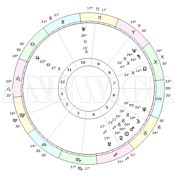 | | ΘΕΣΕΙΣ ΠΛΑΝΗΤΩΝ ΑΣΤΡΟΛΟΓΙΚΟΥ ΧΑΡΤΗ ΤΗΣ ΣΤΙΓΜΗΣ ΑΥΤΗΣ | | | | Πλανήτης | Ζώδιο | Μοίρες | Δεκαήμ. | Σε οίκο | Απόκλιση | | Ακμές των οίκων | | Ηλιος | Αιγόκερως | 00°07' | Πρώτο | 5 | 23 S 26 | | 1ος | 03°13' | Λέων | | Σελήνη | Αιγόκερως | 18°38' | Δεύτερο | 6 | 26 S 06 | | 2ος | 24°29' | Λέων | | Ερμής | Τοξότης | 13°21' | Δεύτερο | 5 | 21 S 44 | | 3ος | 19°58' | Παρθένος | | Αφροδίτη | Τοξότης | 26°18' | Τρίτο | 5 | 23 S 29 | | 4ος | 21°23' | Ζυγός | | Αρης | Αιγόκερως | 04°52' | Πρώτο | 6 | 24 S 10 | | 5ος | 27°20' | Σκορπιός | | Δίας | Καρκίνος | 22°38'R | Τρίτο | 12 | 21 N 45 | | 6ος | 02°30' | Αιγόκερως | | Κρόνος | Ιχθείς | 25°46' | Τρίτο | 9 | 03 S 47 | | 7ος | 03°13' | Υδροχόος | | Ουρανός | Ταύρος | 28°16'R | Τρίτο | 11 | 19 N 34 | | 8ος | 24°29' | Υδροχόος | | Ποσειδώνας | Ιχθείς | 29°25' | Τρίτο | 9 | 01 S 28 | | 9ος | 19°58' | Ιχθείς | | Πλούτωνας | Υδροχόος | 02°25' | Πρώτο | 6 | 23 S 17 | | 10ος | 21°23' | Κριός | | Β. Δεσμός | Ιχθείς | 12°43' | Δεύτερο | 8 | 06 S 47 | | 11ος | 27°20' | Ταύρος | | Ωροσκόπος | Λέων | 03°13' | Πρώτο | | | 12ος | 02°30' | Καρκίνος | | Μεσουράνημα | Κριός | 21°23' | Τρίτο | | | |