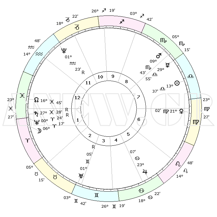 | ΘΕΣΕΙΣ ΠΛΑΝΗΤΩΝ ΑΣΤΡΟΛΟΓΙΚΟΥ ΧΑΡΤΗ ΤΗΣ ΣΤΙΓΜΗΣ ΑΥΤΗΣ | | Πλανήτης | Ζώδιο | Μοίρες | Δεκαήμ. | Σε οίκο | Απόκλιση | | Ακμές των οίκων | Ηλιος | Ζυγός | 13°31' | Δεύτερο | 8 | 05 S 20 | | 1ος | 03°04' | Υδροχόος | Σελήνη | Κριός | 04°52' | Πρώτο | 2 | 03 N 19 | | 2ος | 17°38' | Ιχθείς | Ερμής | Ζυγός | 29°46' | Τρίτο | 9 | 12 S 06 | | 3ος | 25°35' | Κριός | Αφροδίτη | Παρθένος | 20°54' | Τρίτο | 8 | 04 N 54 | | 4ος | 23°32' | Ταύρος | Αρης | Σκορπιός | 09°39' | Πρώτο | 9 | 14 S 50 | | 5ος | 16°05' | Δίδυμοι | Δίας | Καρκίνος | 23°06' | Τρίτο | 6 | 21 N 29 | | 6ος | 07°37' | Καρκίνος | Κρόνος | Ιχθείς | 27°29'R | Τρίτο | 2 | 03 S 18 | | 7ος | 03°04' | Λέων | Ουρανός | Δίδυμοι | 01°05'R | Πρώτο | 4 | 20 N 10 | | 8ος | 17°38' | Παρθένος | Ποσειδώνας | Κριός | 00°24'R | Πρώτο | 2 | 01 S 06 | | 9ος | 25°35' | Ζυγός | Πλούτωνας | Υδροχόος | 01°23'R | Πρώτο | 12 | 23 S 32 | | 10ος | 23°32' | Σκορπιός | Β. Δεσμός | Ιχθείς | 16°45' | Δεύτερο | 1 | 05 S 14 | | 11ος | 16°05' | Τοξότης | Ωροσκόπος | Υδροχόος | 03°04' | Πρώτο | | | 12ος | 07°37' | Αιγόκερως | Μεσουράνημα | Σκορπιός | 23°32' | Τρίτο | | | |