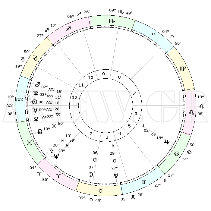 | | ΘΕΣΕΙΣ ΠΛΑΝΗΤΩΝ ΑΣΤΡΟΛΟΓΙΚΟΥ ΧΑΡΤΗ ΤΗΣ ΣΤΙΓΜΗΣ ΑΥΤΗΣ | | | | Πλανήτης | Ζώδιο | Μοίρες | Δεκαήμ. | Σε οίκο | Απόκλιση | | Ακμές των οίκων | | Ηλιος | Υδροχόος | 06°15' | Πρώτο | 1 | 18 S 42 | | 1ος | 23°51' | Αιγόκερως | | Σελήνη | Ταύρος | 06°19' | Πρώτο | 3 | 17 N 44 | | 2ος | 06°49' | Ιχθείς | | Ερμής | Υδροχόος | 09°22' | Πρώτο | 1 | 19 S 55 | | 3ος | 16°07' | Κριός | | Αφροδίτη | Υδροχόος | 10°55' | Δεύτερο | 1 | 18 S 42 | | 4ος | 15°41' | Ταύρος | | Αρης | Υδροχόος | 02°12' | Πρώτο | 1 | 20 S 39 | | 5ος | 08°57' | Δίδυμοι | | Δίας | Καρκίνος | 18°02'R | Δεύτερο | 6 | 22 N 31 | | 6ος | 00°12' | Καρκίνος | | Κρόνος | Ιχθείς | 28°12' | Τρίτο | 2 | 02 S 43 | | 7ος | 23°51' | Καρκίνος | | Ουρανός | Ταύρος | 27°29'R | Τρίτο | 4 | 19 N 25 | | 8ος | 06°49' | Παρθένος | | Ποσειδώνας | Ιχθείς | 29°59' | Τρίτο | 2 | 01 S 13 | | 9ος | 16°07' | Ζυγός | | Πλούτωνας | Υδροχόος | 03°31' | Πρώτο | 1 | 23 S 03 | | 10ος | 15°41' | Σκορπιός | | Β. Δεσμός | Ιχθείς | 10°50' | Δεύτερο | 2 | 07 S 30 | | 11ος | 08°57' | Τοξότης | | Ωροσκόπος | Αιγόκερως | 23°51' | Τρίτο | | | 12ος | 00°12' | Αιγόκερως | | Μεσουράνημα | Σκορπιός | 15°41' | Δεύτερο | | | |